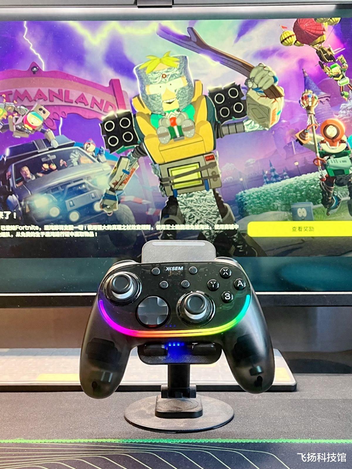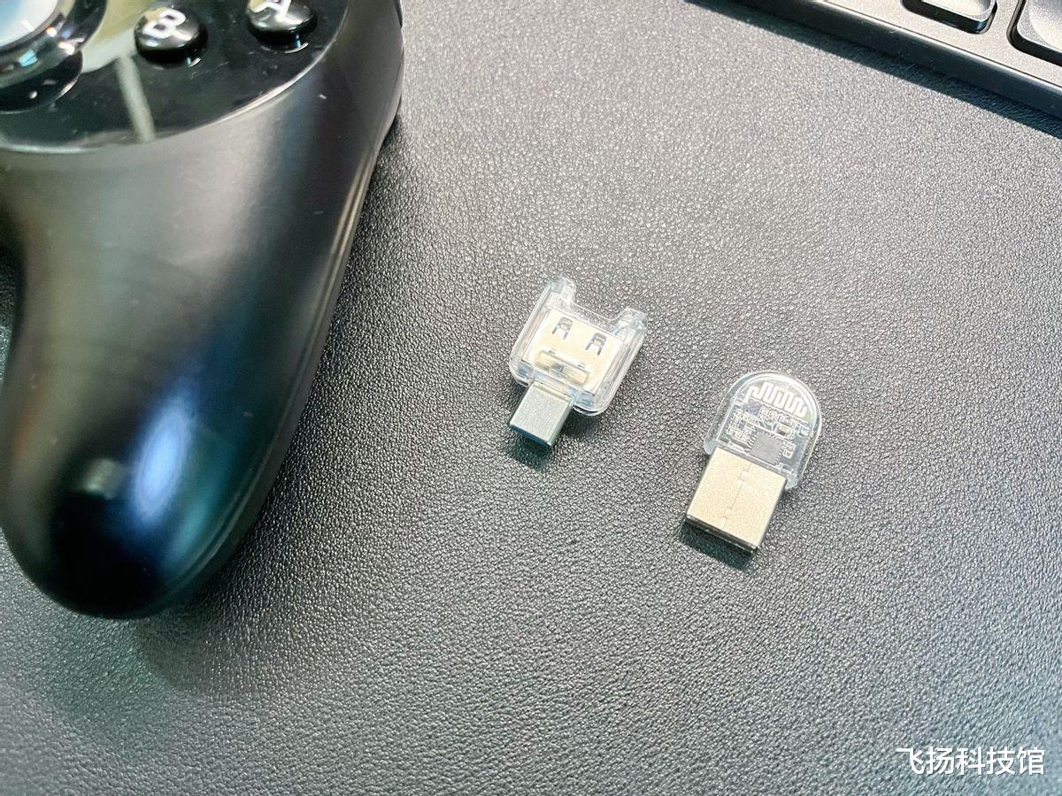 配套的 2.4G USB 插头也做了同风格的半透设计,和手柄形成统一的视觉风格,摆在一起满满的游戏味;更贴心的是双插口转接头,Type C 口和 USB 口双适配,接电脑、手机、Switch 都不用额外找转接配件,随手一插就能用,从外观到小配件的设计,都精准踩中了玩家的实用需求,这个细节打磨在同定位里格外难得。