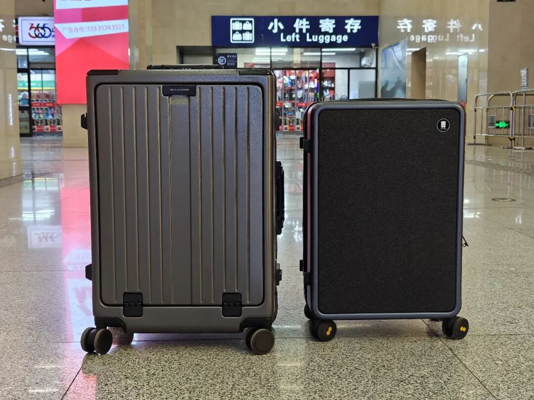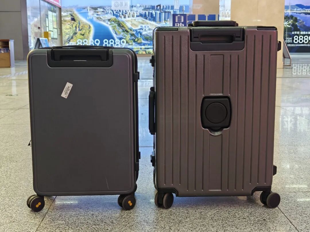 行李箱尺寸该怎么选?先给纠结尺寸的朋友划个重点:行李箱按“英寸”标注(1英寸≈2.54cm),核心看长宽高之和,不同尺寸对应不同场景——20寸是登机箱(30-40L),适合1-3天短途;24寸(60-80L)长宽高约38×60×28cm,容量刚好装下3-7天衣物+年货礼品,是托运无压力、便携不占地的中长途“黄金尺寸”;26-28寸(80-120L)适合家庭长途,但体积大显笨重;30寸以上则是留学专用,日常用太夸张。下图左侧为GaKior24寸行李箱,右侧为其他品牌20寸行李箱。