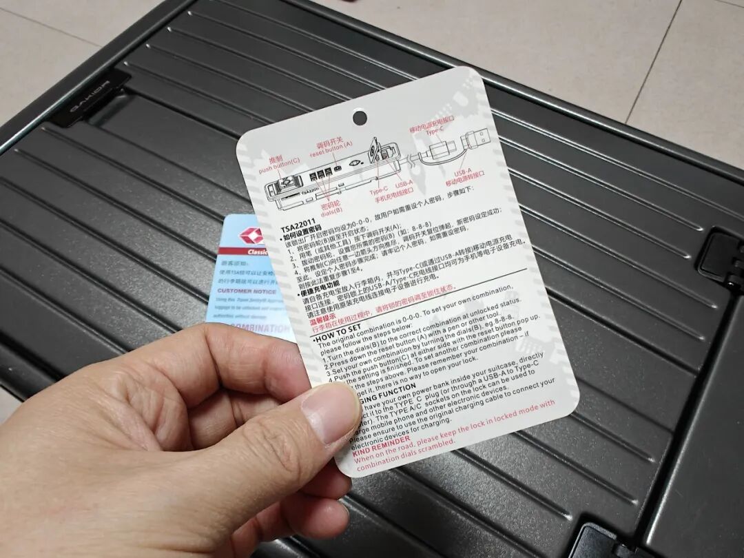 贴心的是GaKior行李箱内还附带了更改行李箱锁密码的流程卡片,按照卡片的指导我们可以轻松设置密码,提升行李安全性。