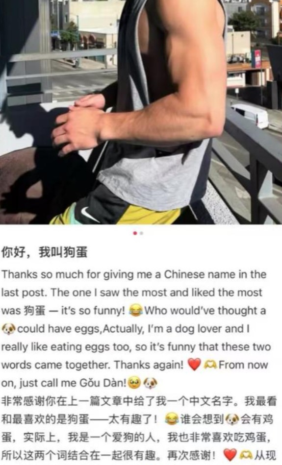 一位来自美国的网友,他喜欢狗也喜欢鸡蛋,于是换上了中国网友给他取的狗蛋的这个名字。