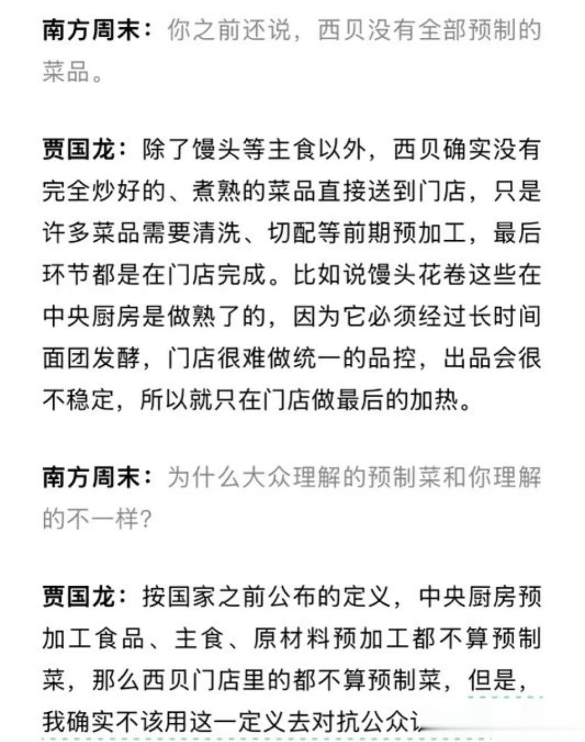 贾国龙还表示,西贝是不可能脱离中央厨房的,因为中央厨房更便于管理和安全把控。