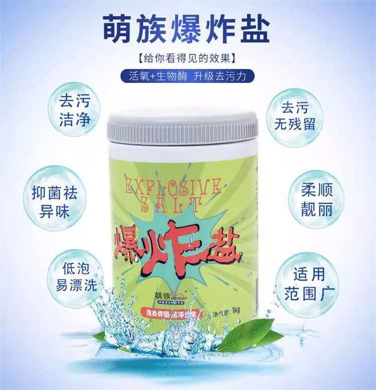 适配场景:主要用于衣物的清洁,尤其是在梅雨季或长期存放后出现霉斑的衣物。此外,萌族爆炸盐还可用于清洁厨房的油污和茶垢,以及卫生间的污渍。