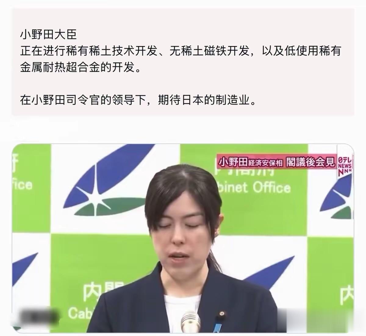 三是高市早苗政府的政客,日本经济大臣小野田纪美表示,“没有什么好担心的,自2010年以来,日本对中国的稀土占比降至60%左右”。并提出“无稀土磁铁计划、回收稀土提炼技术”,摆脱对中国稀土的依赖。日本财务大臣片山皋月宣布,将于本周末(11日)起访美,期间与G7成员国家讨论关键矿产问题。