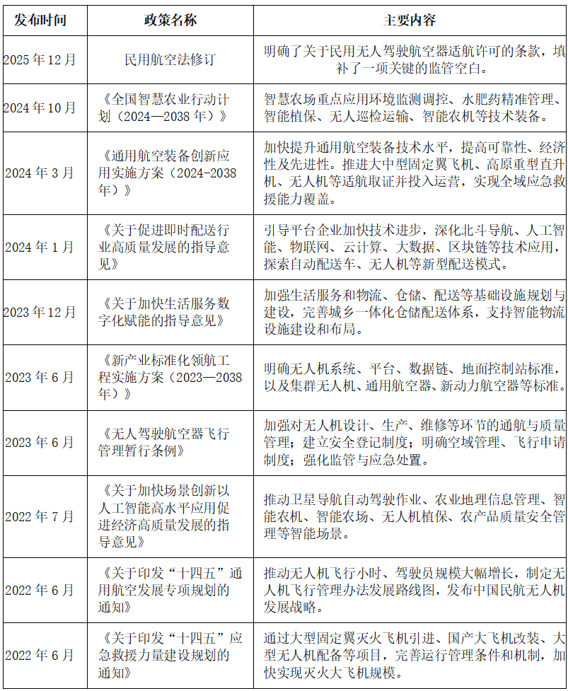 近年来,我国发布多项政策鼓励、支持、规范无人机行业发展,例如《通用航空装备创新应用实施方案(2024-2030年)》、《关于加快生活服务数字化赋能的指导意见》、《新产业标准化领航工程实施方案(2023─2035年)》、《无人驾驶航空器飞行管理暂行条例》、《关于印发“十四五”通用航空发展专项规划的通知》等。政策的发布为无人机行业的发展提供了明确、广阔的市场前景,为企业提供了良好的生产经营环境。具体情况列示如下: