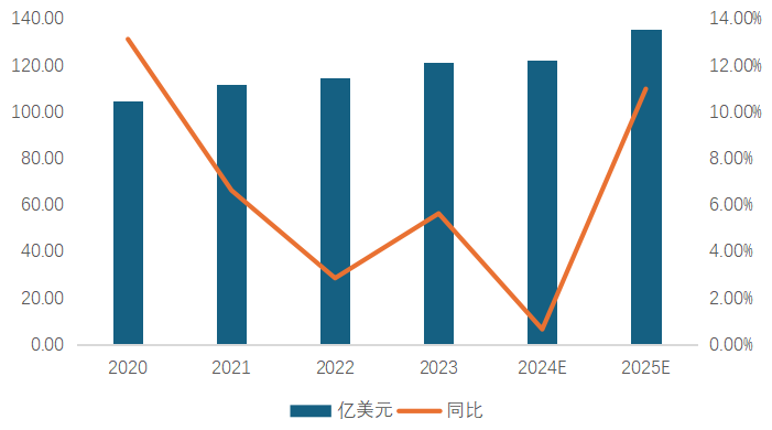 在信息化战争的发展形势下,无人机等新型装备需求大幅提升,再加上不断爆发的安全问题、领土争端,装备无人机成为了以较低成本增强自身国防实力的有效手段,全球军用无人机需求不断扩大。2023年全球军用无人机市场规模121.24亿美元。2024年全球军用无人机市场规达122.03亿美元,2025年达到135.43亿美元。