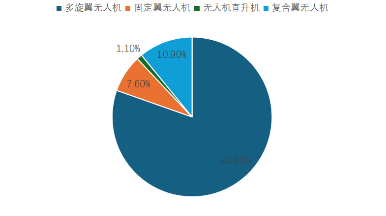 国内工业级无人机市场规模细分中,多旋翼无人机占据主要类型。根据数据,2024年中国工业级无人机市场中,多旋翼无人机、复合翼无人机、固定翼无人机分别占比为80.40%、10.90%、7.60%。