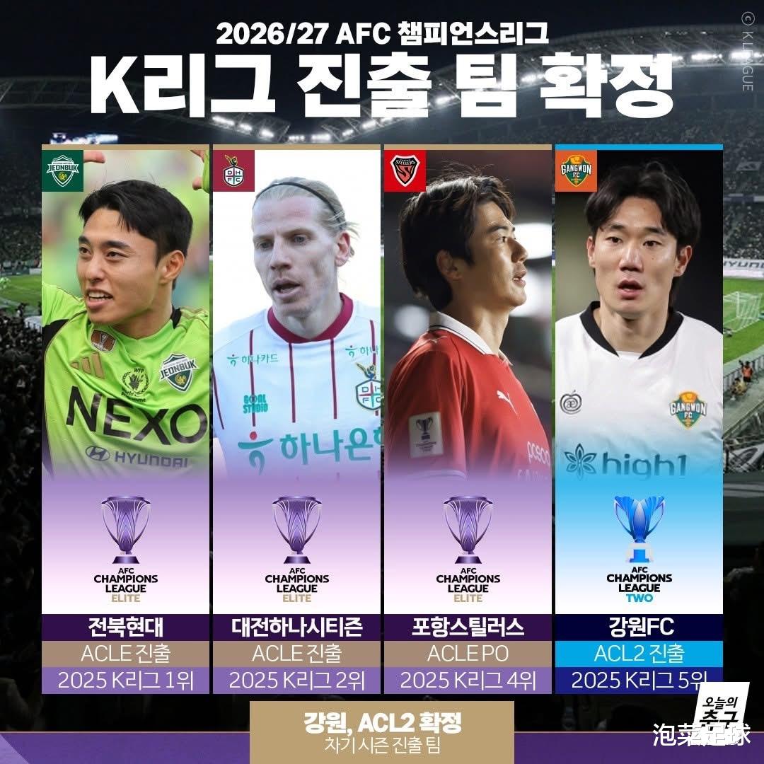 随着2025-26赛季亚冠精英联赛及亚冠二级联赛十六强战全部结束,参赛的韩国球队无一晋级,至此2026-27赛季K联赛球队的亚冠参赛席位分配也正式敲定。根据联赛成绩分配,2025赛季K联赛冠军全北现代汽车以及亚军大田韩亚市民将直接获得亚冠精英联赛正赛资格。联赛第四名浦项铁人则将进入附加赛,为精英联赛正赛席位做最后一搏。