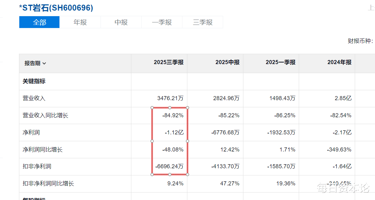 坦率地说,情况很不乐观。从*ST岩石2025年连续三个季度的财务表现来看,在三季度营收仅为3千多万,且同比超过80%的下跌,如此状态下惯性思维,即便年末冲量,也难以弥补前三季度的巨大缺口,2025 年营收突破3亿元的可能性微乎其微。