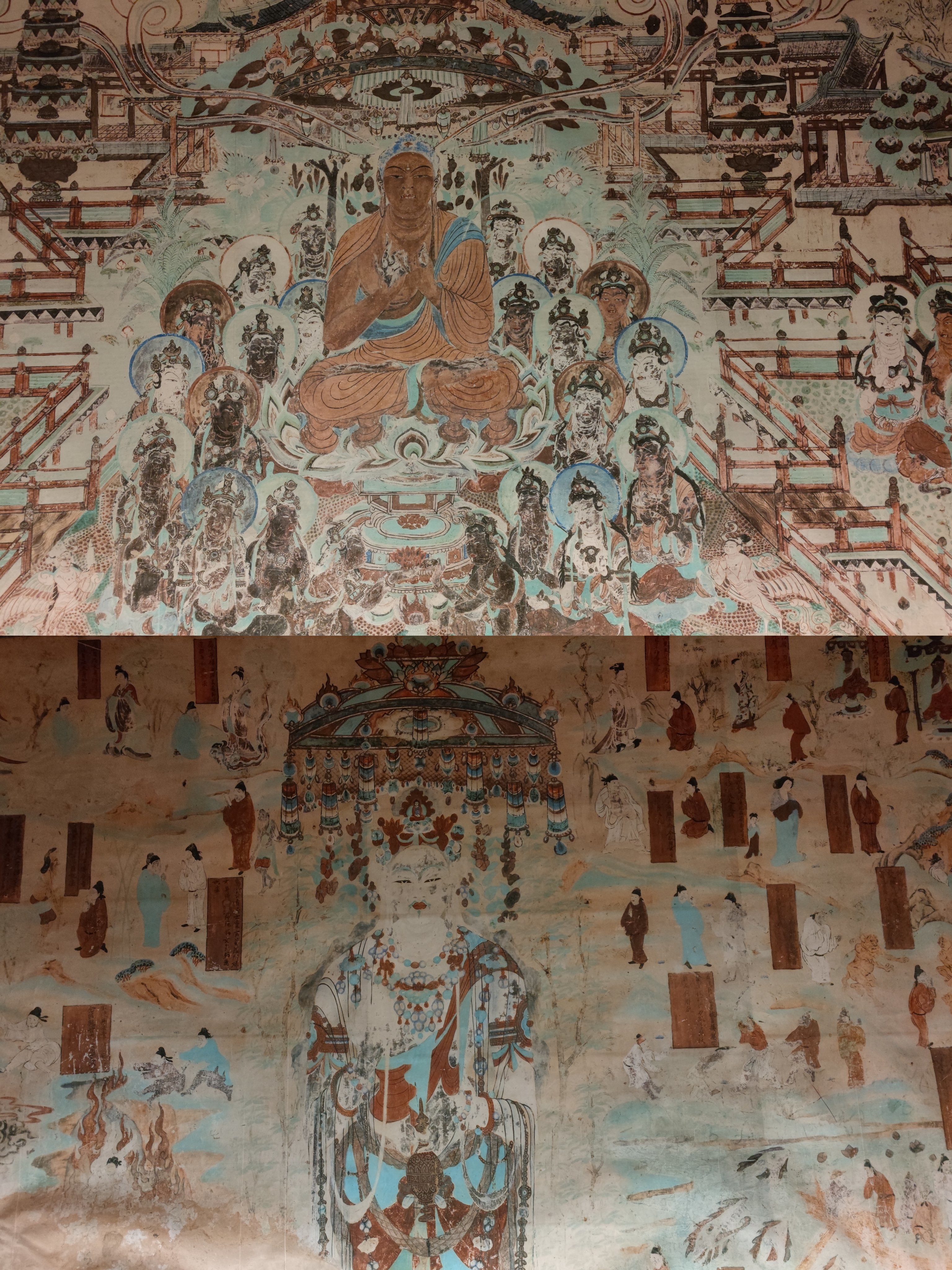 归程的车上,我翻看手机里拍摄的壁画细节。那些褪色的青绿、暗沉的朱红,在数码屏幕上焕发出新的生机。突然注意到一张飞天的特写:她怀抱琵琶逆风飞翔,裙带如流云般舒卷,嘴角那抹微笑,竟与蒙娜丽莎有异曲同工之妙——都是对人类精神之美的礼赞。或许,真正的文明从来不需要壁垒,它如同这大漠的风,自由穿行在时空之间,在每一个虔诚的心灵中种下菩提。