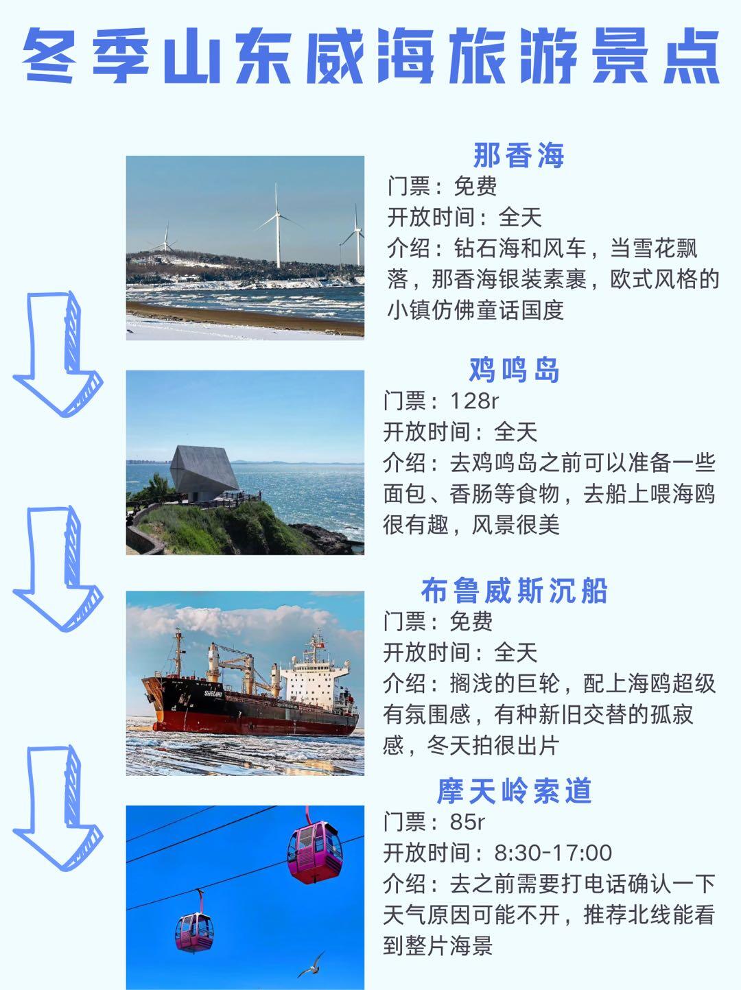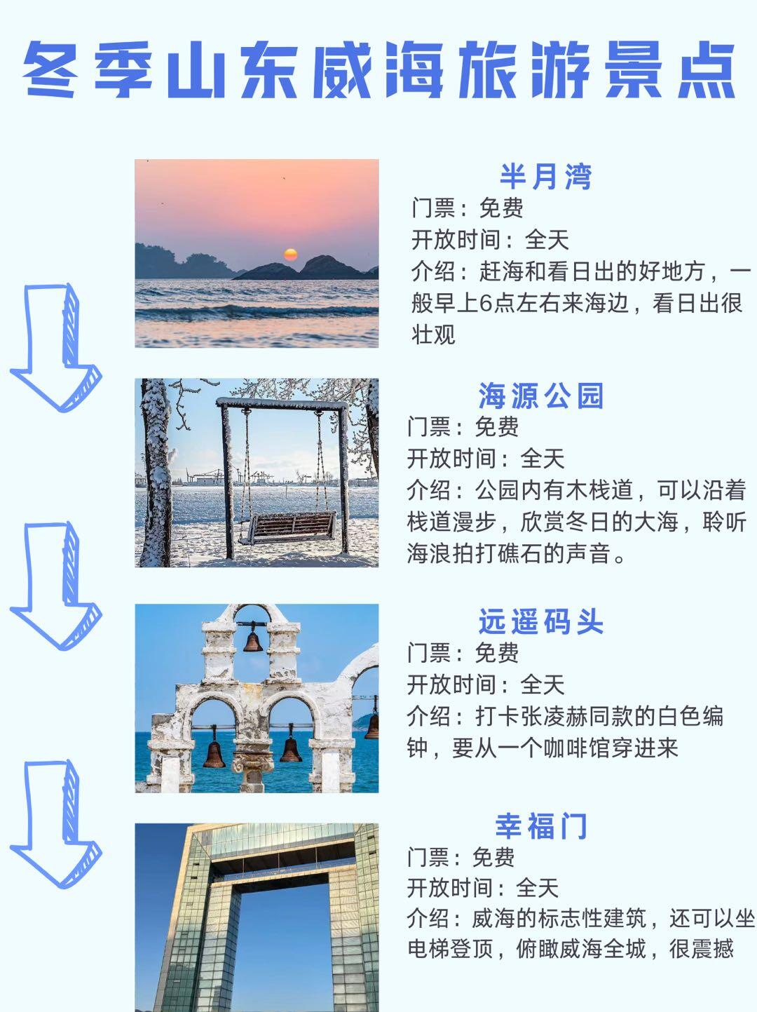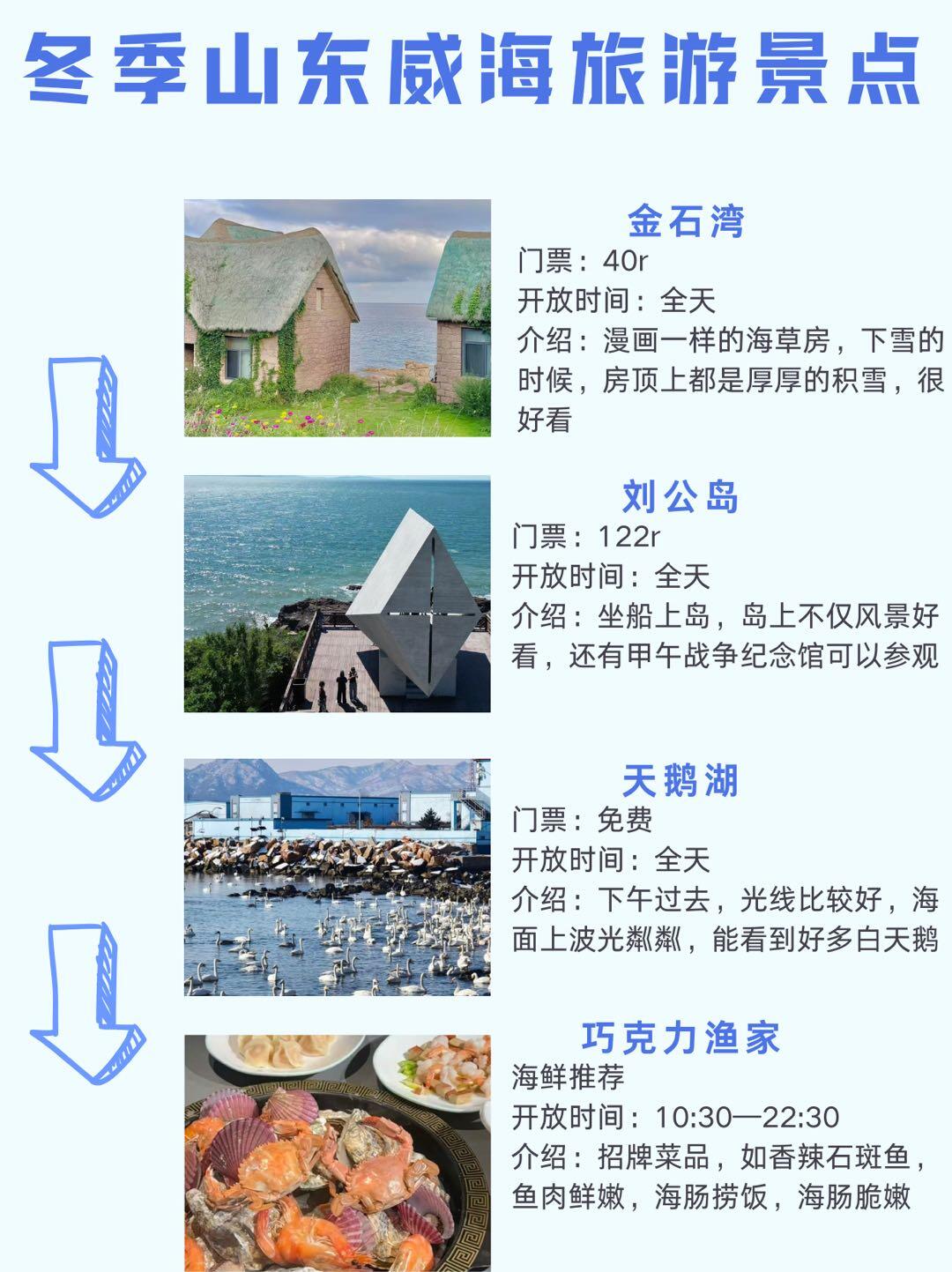 那香海钻石沙滩果然名不虚传,沙子很软,加上白雪覆盖,踩上去很解压;鸡鸣岛很美,坐船的时候还有很多海鸥,悬崖海景震撼⛰️,但要注意返航时间;半月湾看日出日落绝佳🌅,雪覆沙滩,海是灰蓝色。海源公园雪厚,简单打雪仗很有趣⛄。刘公岛不仅风景美,还能参观甲午战争纪念馆,,学习历史知识;天鹅湖🦢很壮观,成群的白天鹅