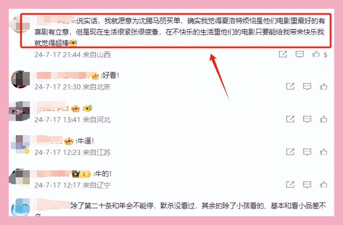 网友们在评论区里也是各种夸赞:“我就是喜欢沈腾马丽的作品,生活已经够辛苦,就指望他们在不开心的时候,用欢笑给我解压了!”