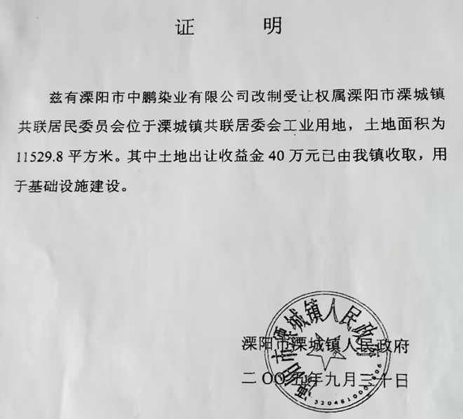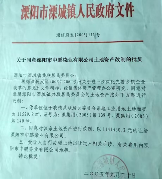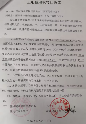 时间回溯到 2005 年 9 月 30 日。溧阳市溧城街道共联社区居民委员会(时称溧城镇共联居民委员会)与溧阳市中鹏染业有限公司签订《土地使用权转让协议》,将 11529.8 平方米(约 17.3 亩)集体工业用地以 99 元 /㎡的价格转让,总价 114 万余元。同日,居委会还与时任社区书记黄志平签订协议,将 2335.3 平方米(约 3.5 亩)土地以同价转让,总价 23 万余元。
