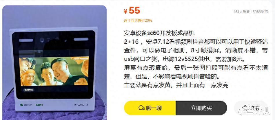 今天在二手鱼里刷到个小玩意,一台能正常开机、带8寸触摸屏的安卓设备,喊价55元,也就是一包烟的价格。它不是什么品牌平板,而是一个SC60开发板的成品机。说白了,就是一些行业设备(比如支付终端、查询机)淘汰下来的核心板,被大佬们刷机改造,套上个壳子,变成了一个能触控的安卓小盒子。