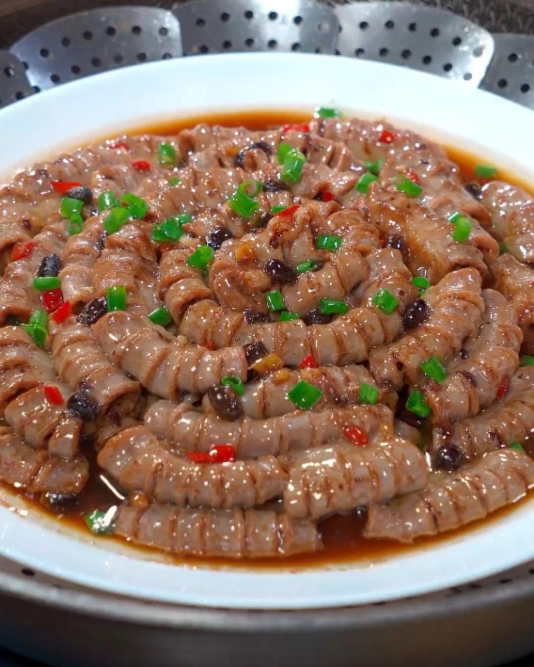 制作方法:先把处理干净的粉肠打上花刀,这样更容易入味。随后起锅烧水,等待锅中水开放入食用盐和食用油,搅拌均匀再把粉肠放入锅中焯水十五秒并捞出备用。接着制作一个灵魂料汁,空碗中放入葱花,蒜末,还有豆豉和红辣椒粒,再淋上热油激发香味。然后进行调味,放入食用盐,白糖,蚝油和生抽,还有淀粉,搅拌均匀就淋在粉肠上,并再次搅拌均匀装盘备用。接着起锅烧水,等待锅中水开把装有肥肠的盘子放上锅蒸10分钟,时间到之后撒入葱花点缀,这道美食就制作好了。这样制作出来的肥肠,肥而不腻,非常好下饭。