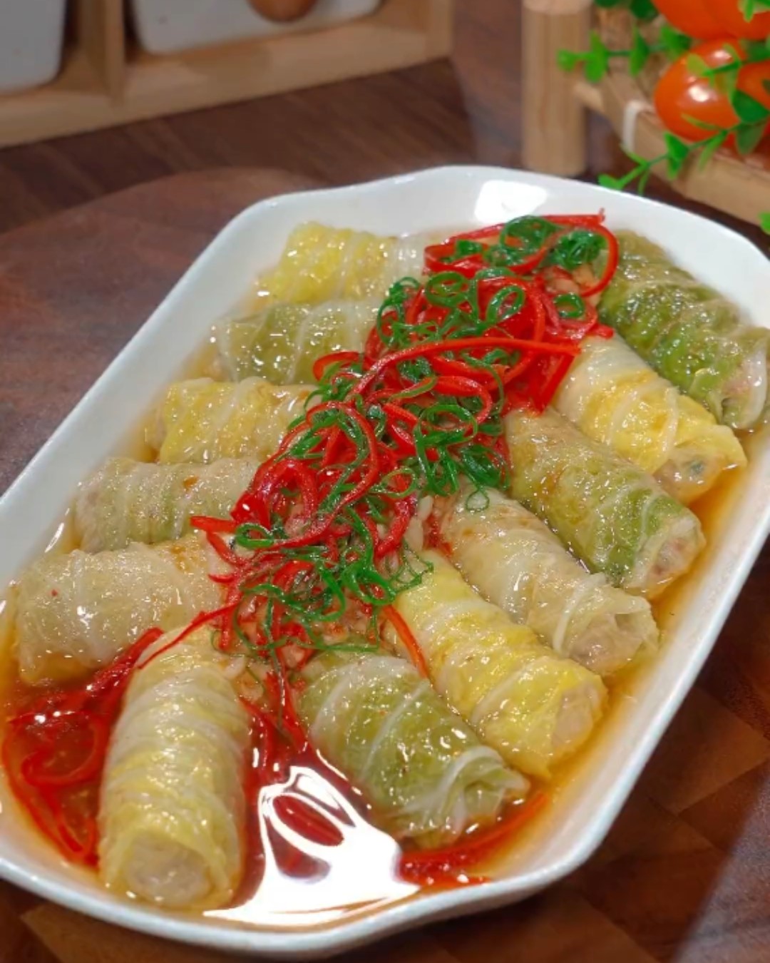 制作方法:先制作一个料汁,空碗中放入蒜末和小米辣,淋入热油激发香味,再倒入蚝油和生抽,白糖,搅拌均匀留着备用。接着把需要用到的肉末腌制一下,放入葱姜蒜,还有料酒和食用盐,生抽,胡椒粉,淀粉,并打入一个鸡蛋,再把它搅拌均匀腌制十分钟。然后起锅烧水,等待锅中水开,放入食用盐和食用油,再把白菜放入锅中焯水,熟透之后把白菜铺平并把肉末整成圆状,放在铺平的白菜中,接着把白菜卷起来装盘,摆放成鞭炮的造型再放入锅中蒸十分钟。时间到之后放上青红辣椒丝并淋入热油激发香味,再放入少量生抽,这道美食就制作好了。荤素结合,而且色香味俱全,是否符合你的口味?