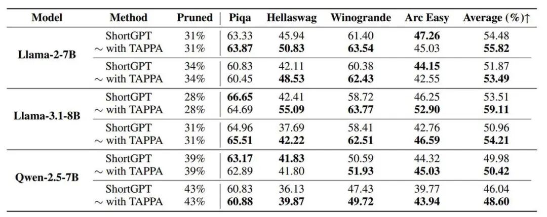 结构化剪枝:q-similarity 与 ShortGPT [2] 的 Block Influence 结合,形成更可靠的层重要性评分。实验证明,TAPPA 在多个模型与剪枝比例下均获得提升,其中在 LLaMA-3.1-8B、28% 剪枝比例时,四个任务的平均准确率提升了 5.6%。