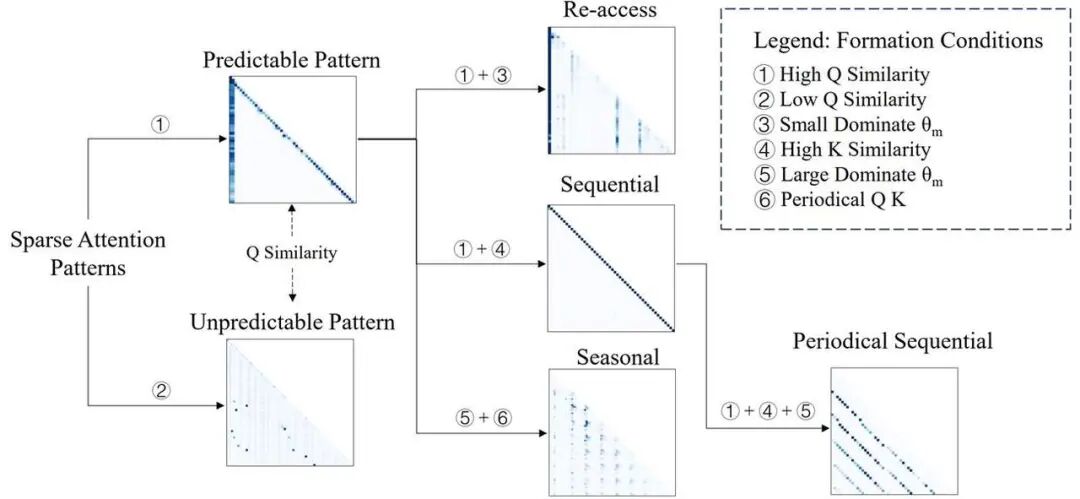 图 2:TAPPA 用统一的形成条件解释多类稀疏注意力模式,并把 q-similarity 作为是否可预测的因素。