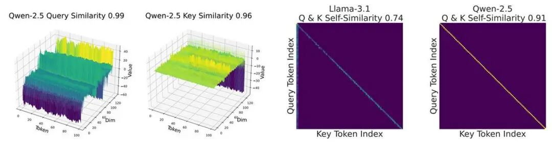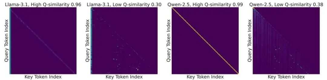 图 4:顺序型对角线与 Q、K 自相似性的关系示例。高 Q 相似性与高 K 相似性共同推动顺序模式形成。