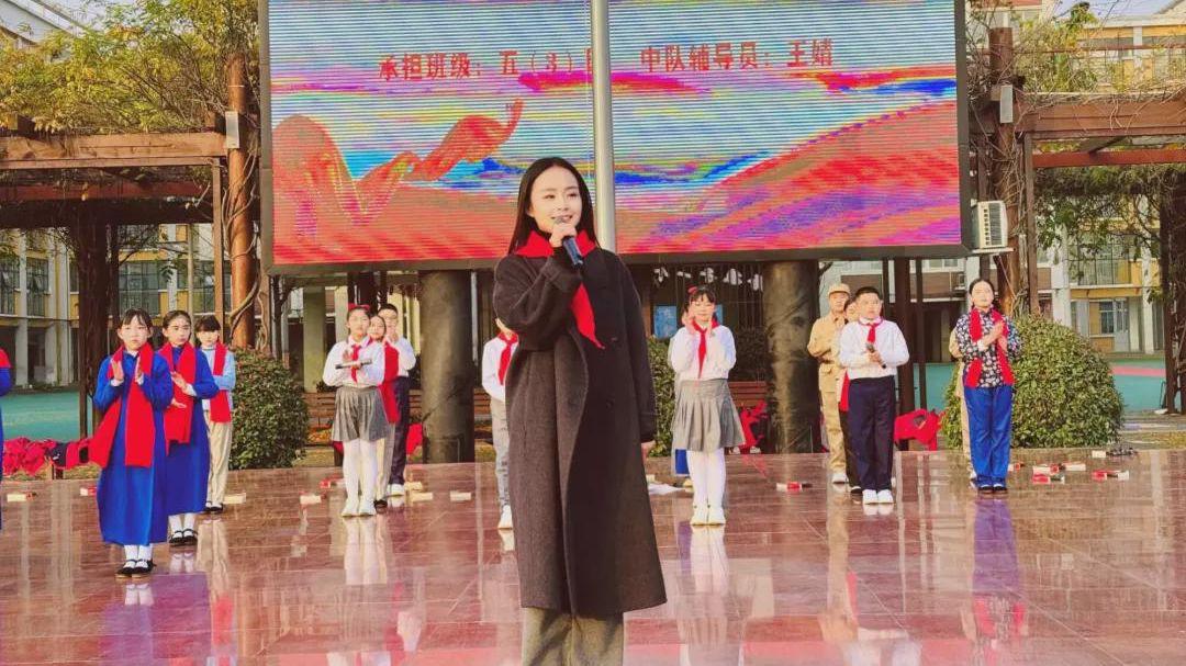 “信仰之光映初心,红色书香润校园” 主题环节中,五(3)中队辅导员王婧带领师生走进《红岩》的峥嵘岁月。“江姐绣红旗的身影、成岗慷慨就义的场景,依然是激励我们前行的精神力量。” 王婧的深情讲述让在场师生穿越时空,与革命先烈产生精神共鸣。随后,“竹签子是竹子做的,共产党员的意志是钢铁” 等经典语句的集体诵读,将革命先烈的坚定信仰化作震撼人心的力量,在校园上空久久回荡。