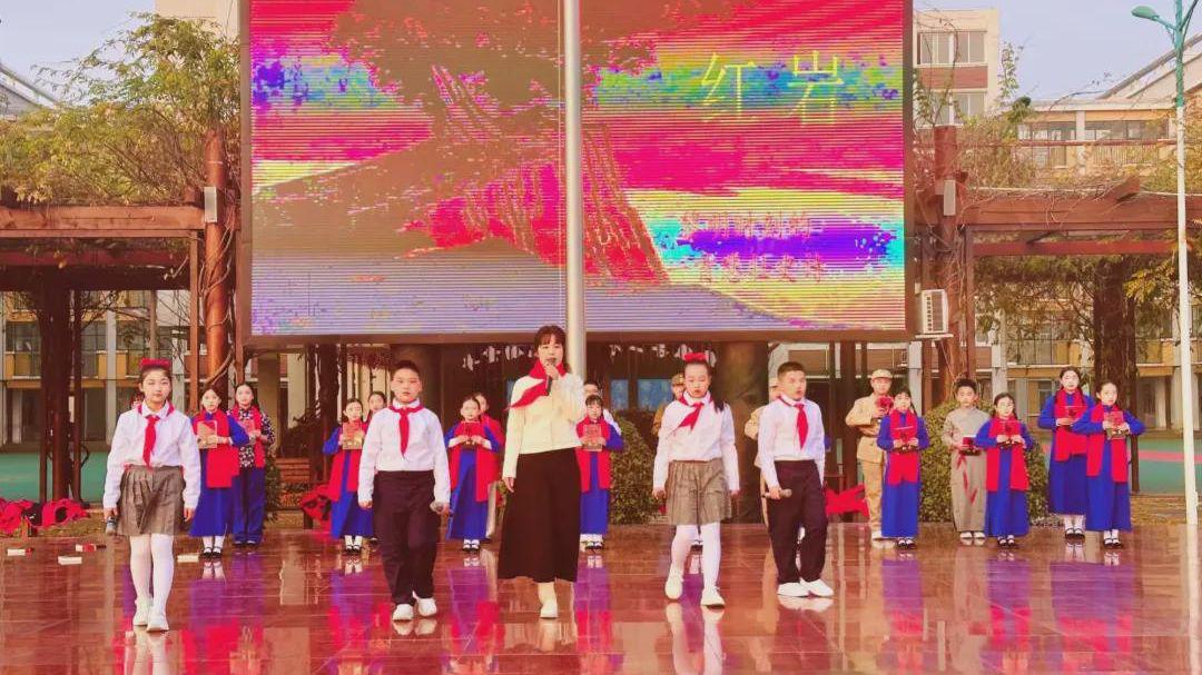 情景剧《绣红旗》将活动推向高潮。小演员们以细腻表演再现革命场景:陈然烈士就义前朗诵《我的 “自白书”》时,“任脚下响着沉重的铁镣” 的激昂词句配合挺拔身姿,尽显革命者铮铮铁骨;当 “中华人民共和国成立了” 的消息传来,江姐与狱友们用珍藏红布绣制五星的场景,在 “一针针,一线线” 的歌声中更令观者动容,生动诠释了革命者对祖国的热爱与理想的坚守。“红色基因,有我传承!请党放心,强国有我!” 少先队员们的庄严誓言,彰显了新时代少年的使命担当。