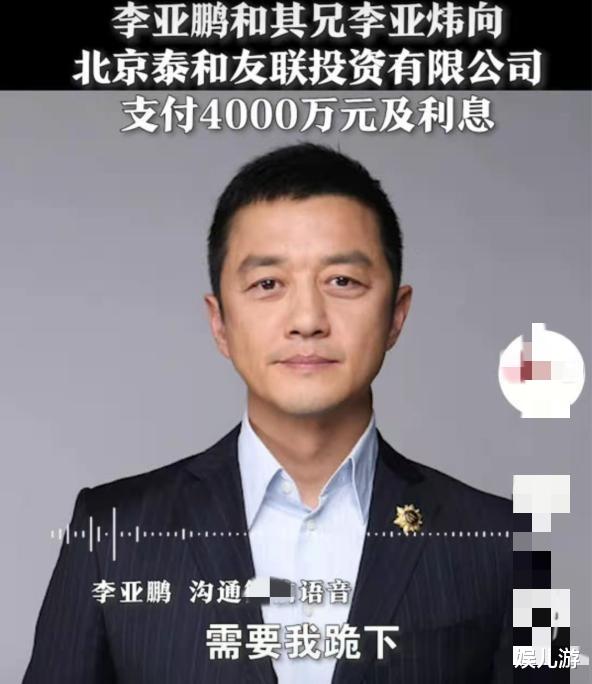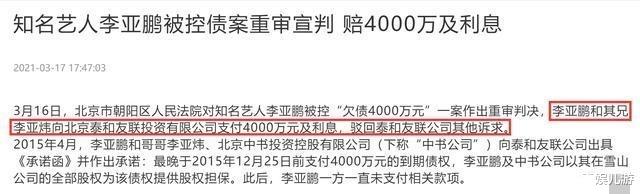 3月16日,北京市朝阳区人民法院对知名艺人李亚鹏被控“欠债4000万元”一案作出重审判决,李亚鹏和其兄李亚炜向北京泰和友联投资有限公司(下称“泰和友联公司”)支付4000万元及利息,驳回泰和友联公司其他诉求。