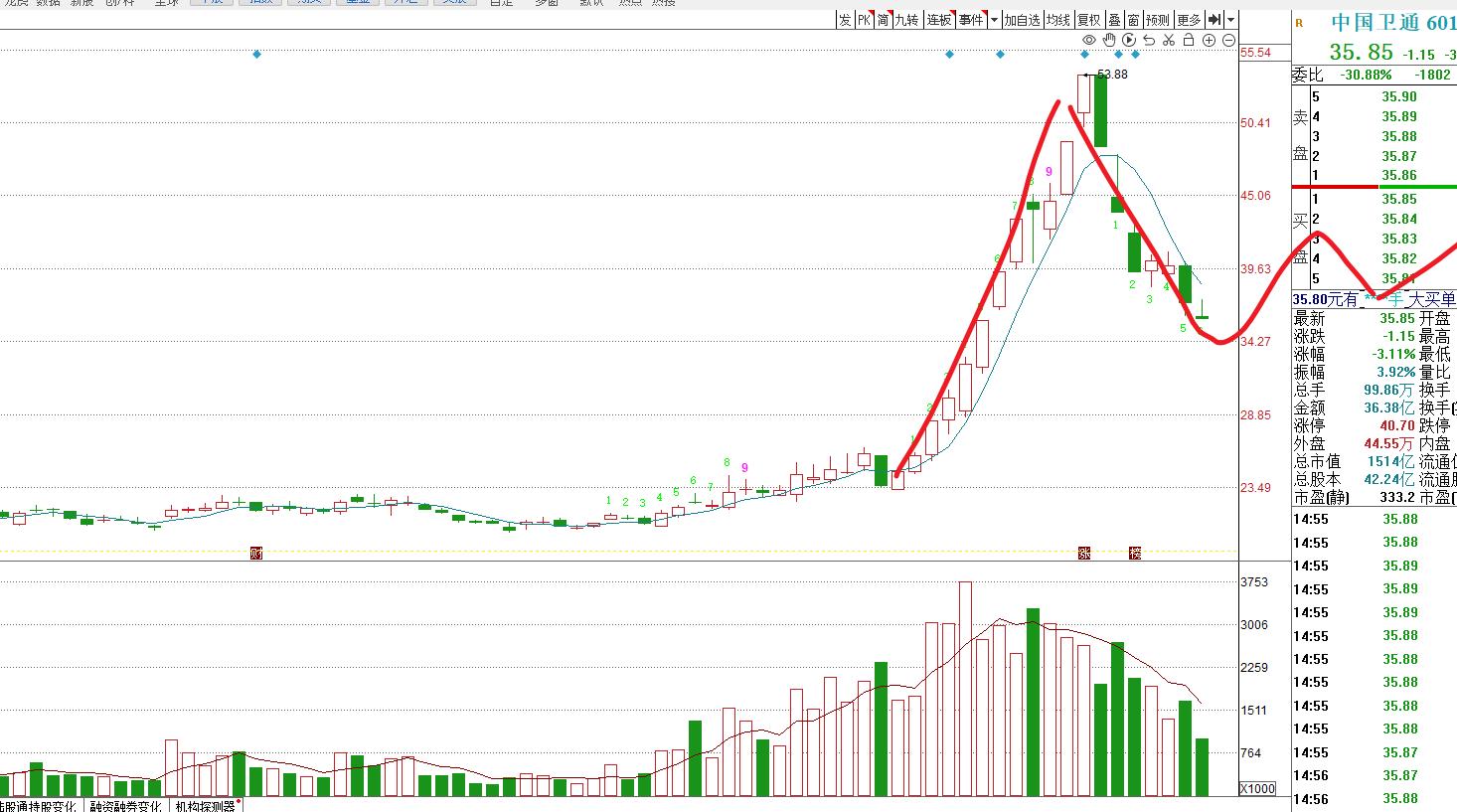 这个调整主要是针对第一波上涨的洗盘,高位明显放量,散户套牢一大批,要折磨这些人的。