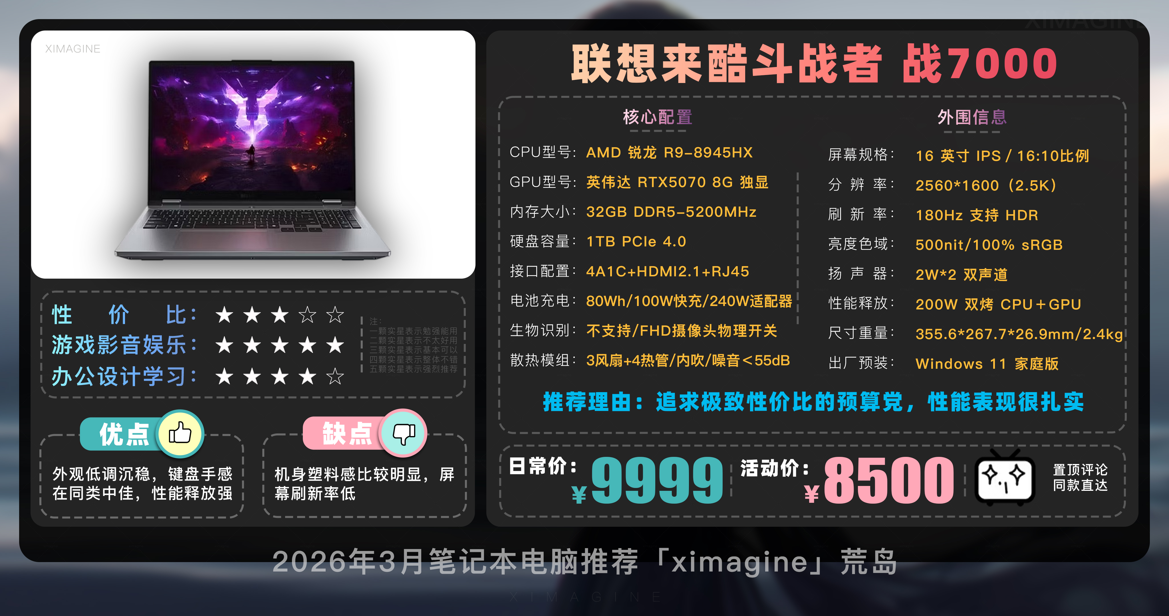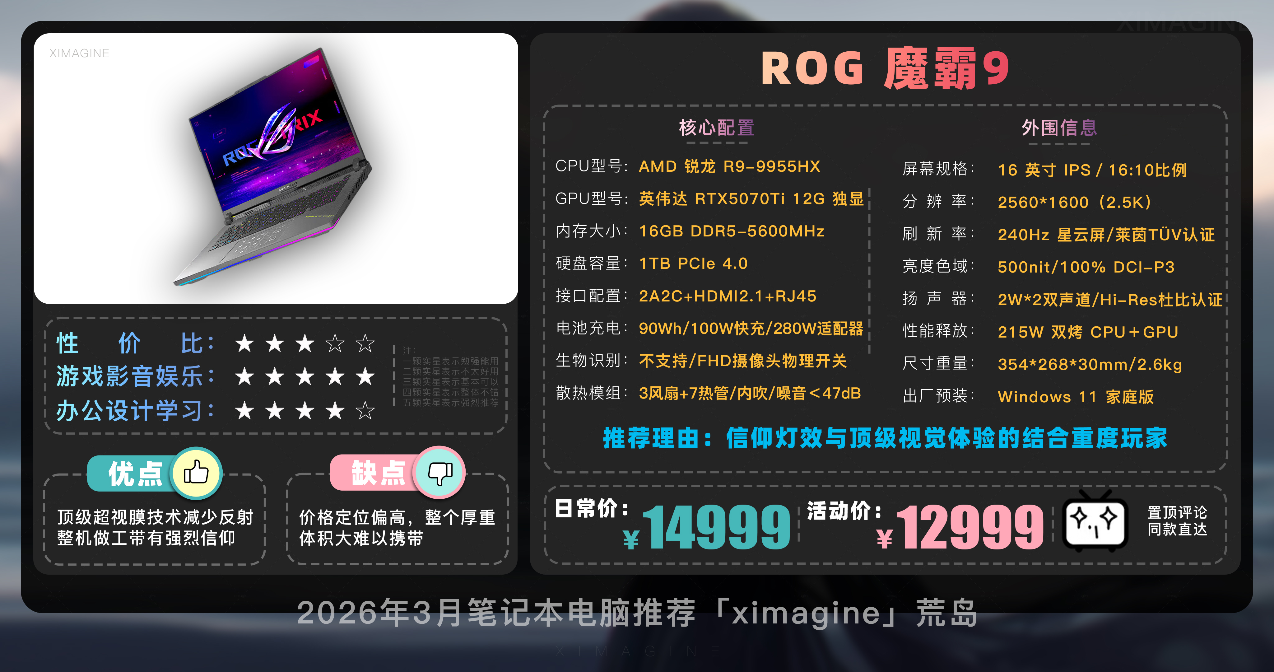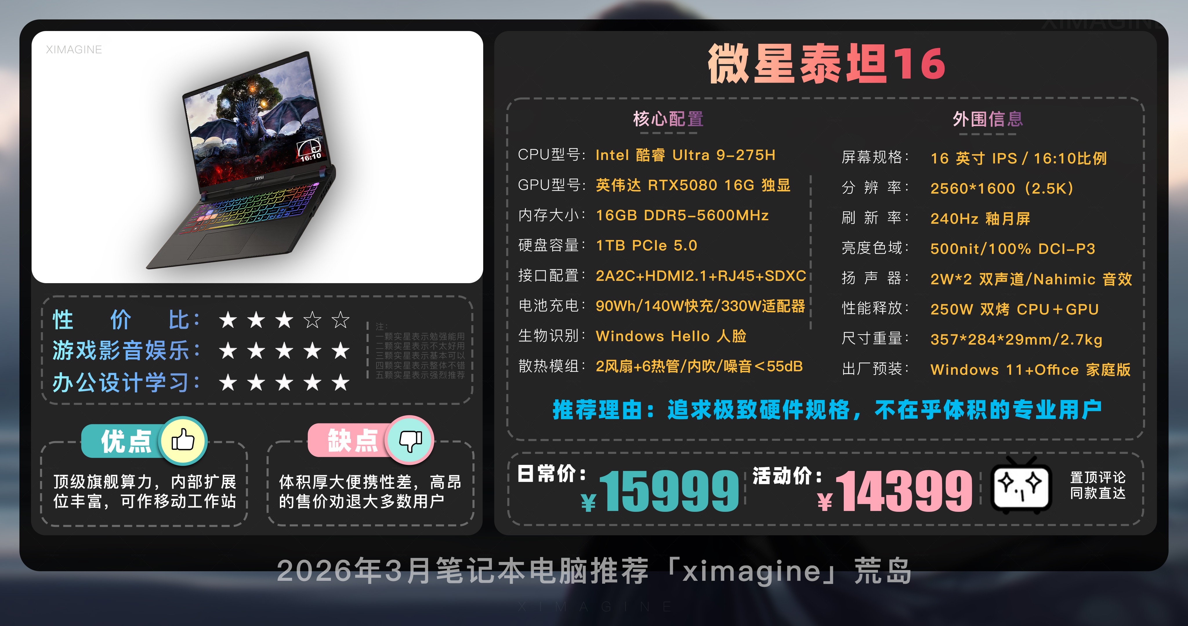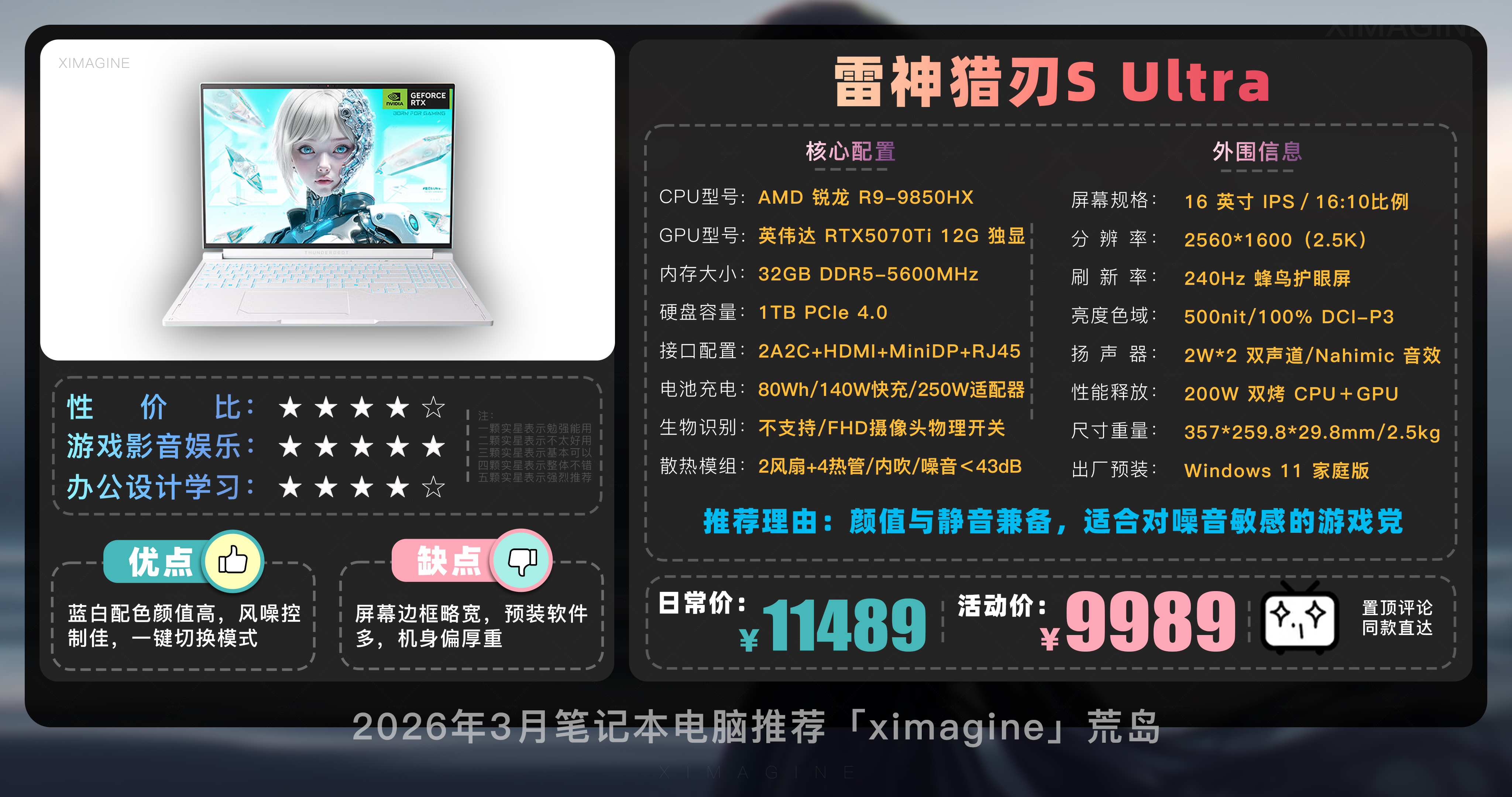 以上就是本期26年3月游戏本电脑推荐清单,如果有心水的型号,可以戳置顶评论区对应链接拿下!买笔电不看谁的广告打得响,得看谁能稳稳当当用上三五年;如果你是个打游戏的,或者要天天熬夜渲染视频,老老实实上游戏本或全能本;如果你每天要穿梭在图书馆、咖啡馆或者出差选轻薄本;如果觉得内容有所帮助,请关注荒岛!如果对选购笔记本电脑还有疑问,欢迎在评论区留言我会尽快回复大家。本期就到这,我是「ximagine」下期再会!