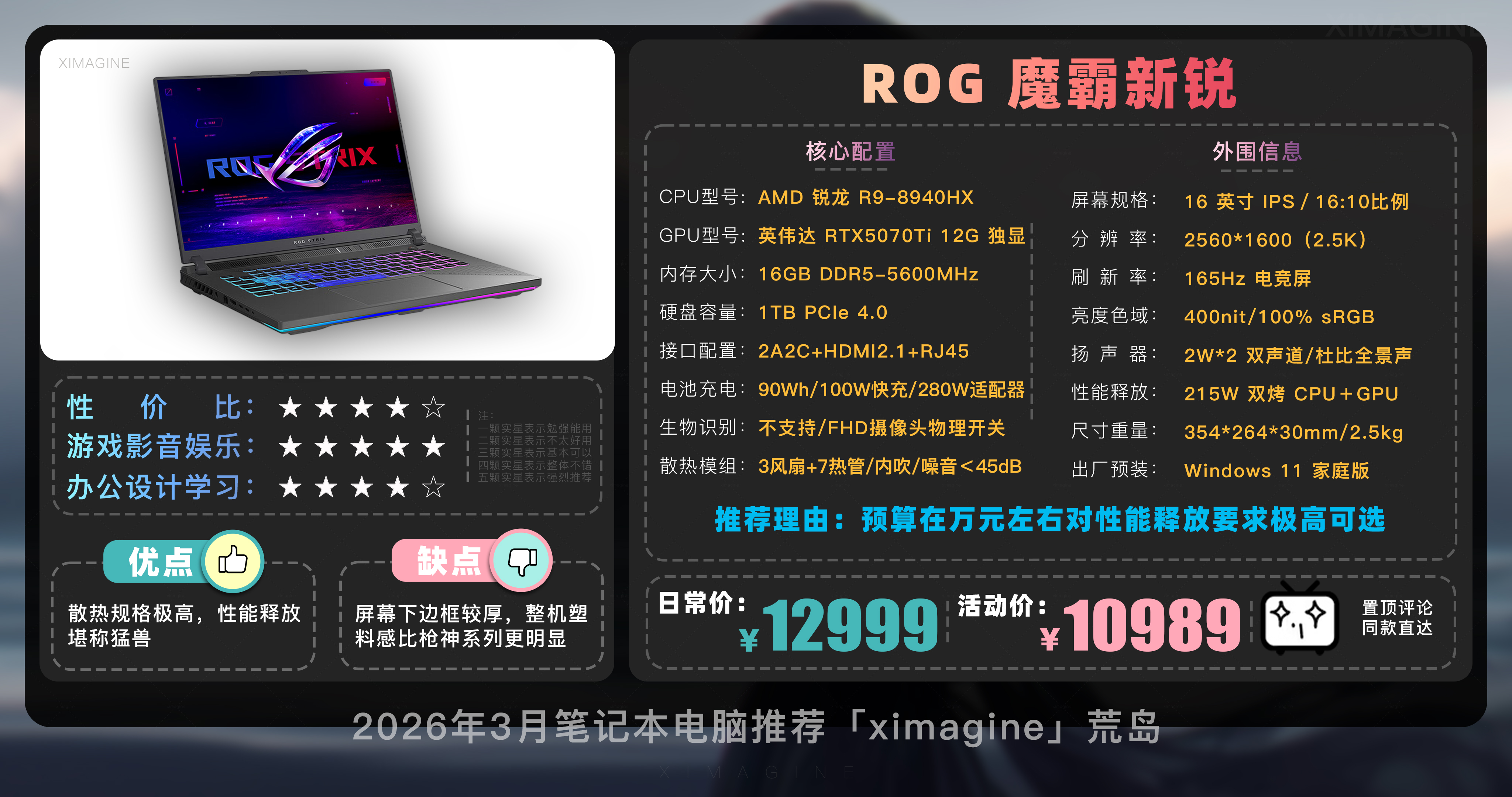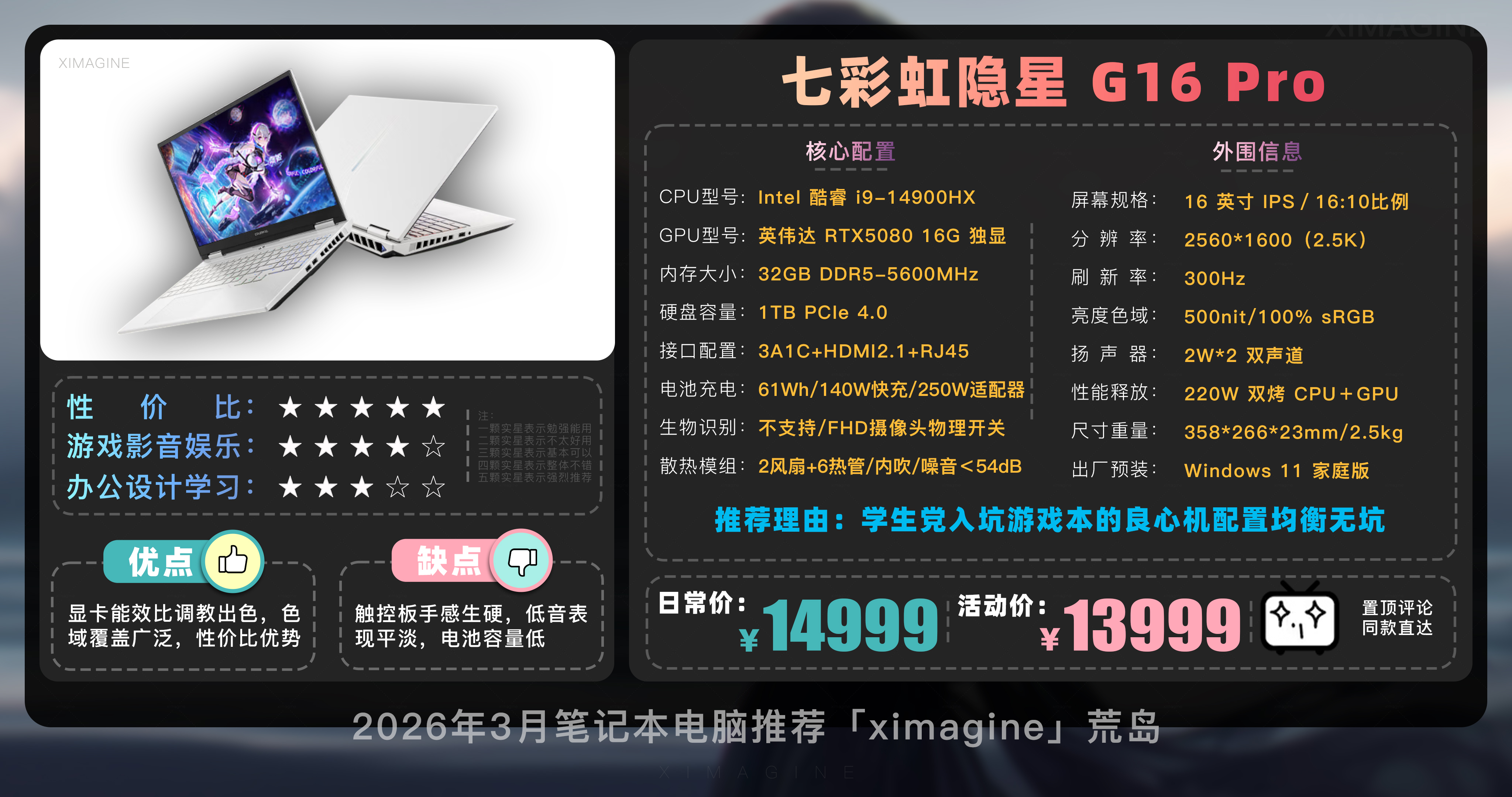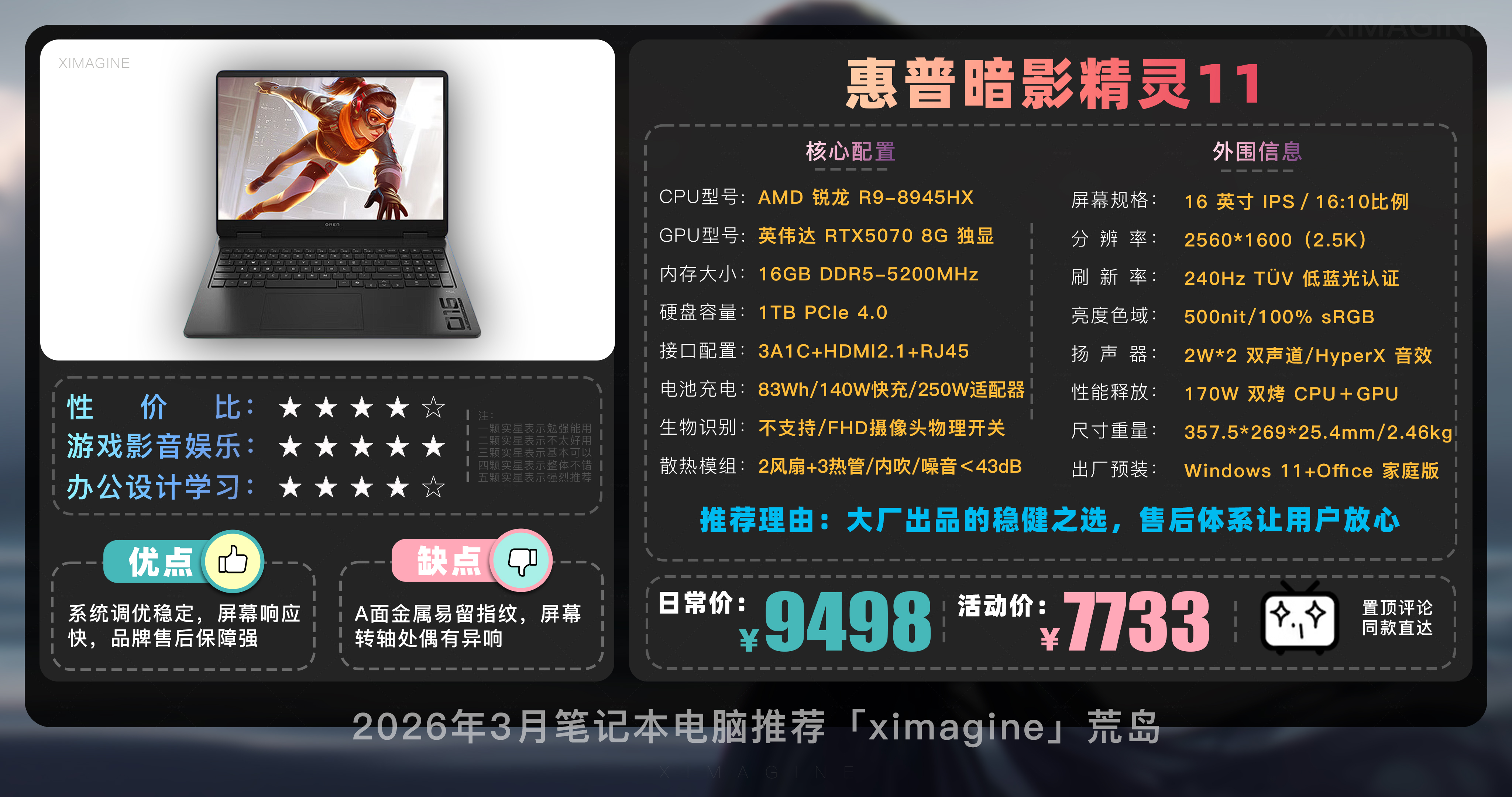 以上就是本期26年3月游戏本电脑推荐清单,如果有心水的型号,可以戳置顶评论区对应链接拿下!买笔电不看谁的广告打得响,得看谁能稳稳当当用上三五年;如果你是个打游戏的,或者要天天熬夜渲染视频,老老实实上游戏本或全能本;如果你每天要穿梭在图书馆、咖啡馆或者出差选轻薄本;如果觉得内容有所帮助,请关注荒岛!如果对选购笔记本电脑还有疑问,欢迎在评论区留言我会尽快回复大家。本期就到这,我是「ximagine」下期再会!