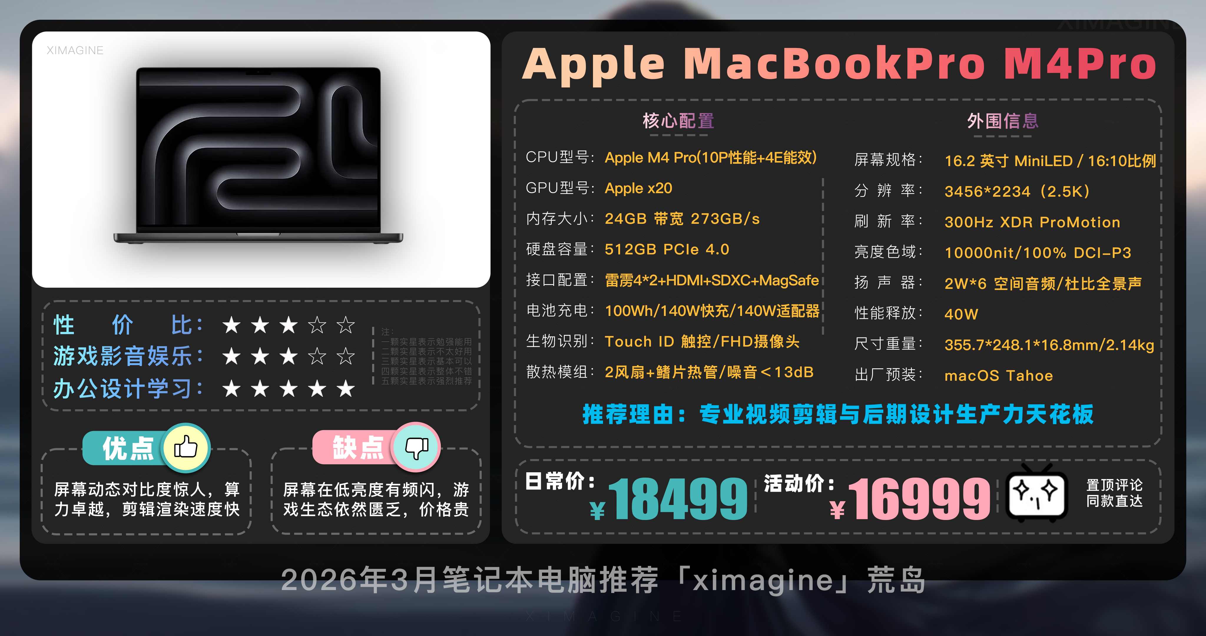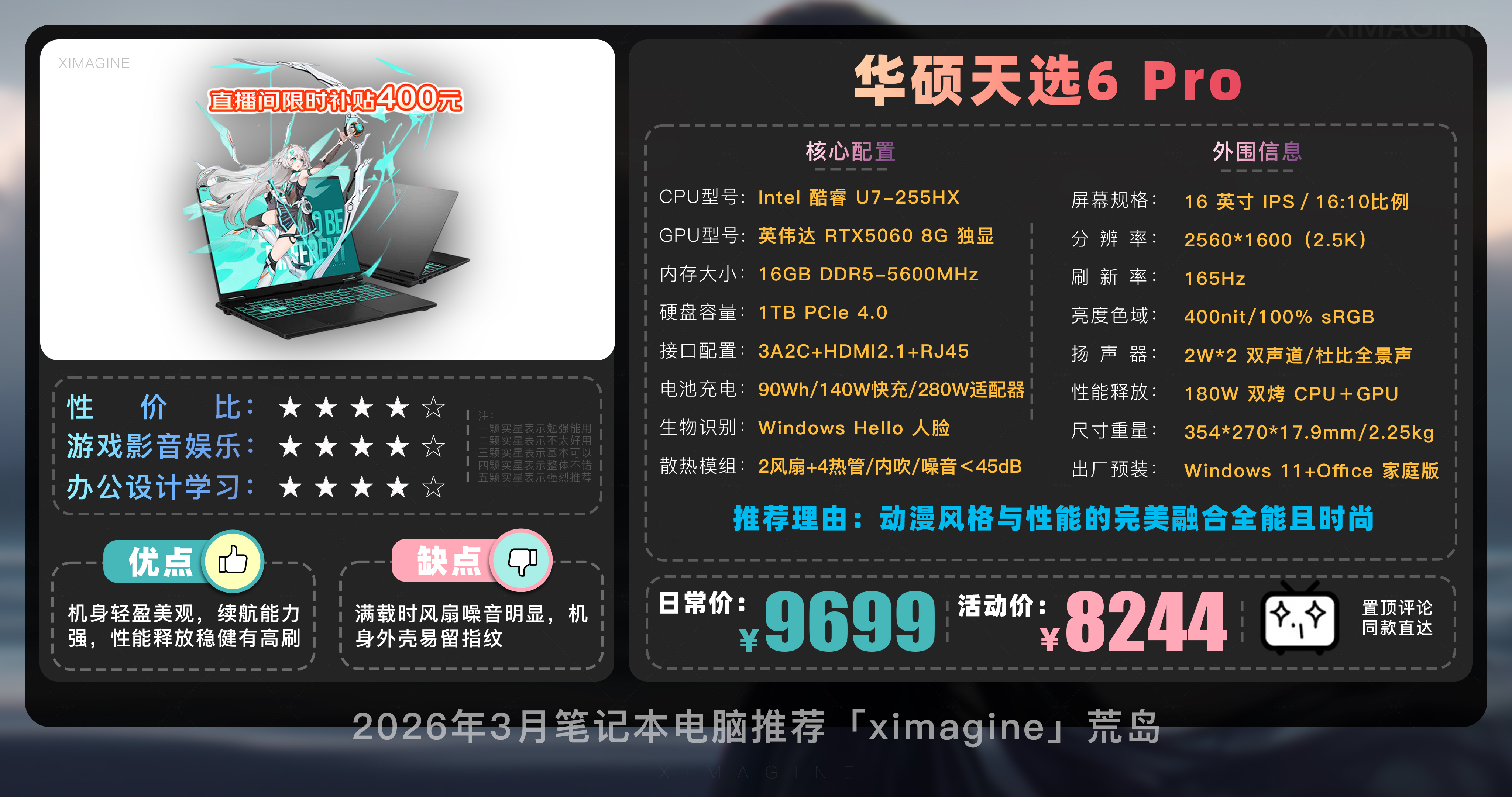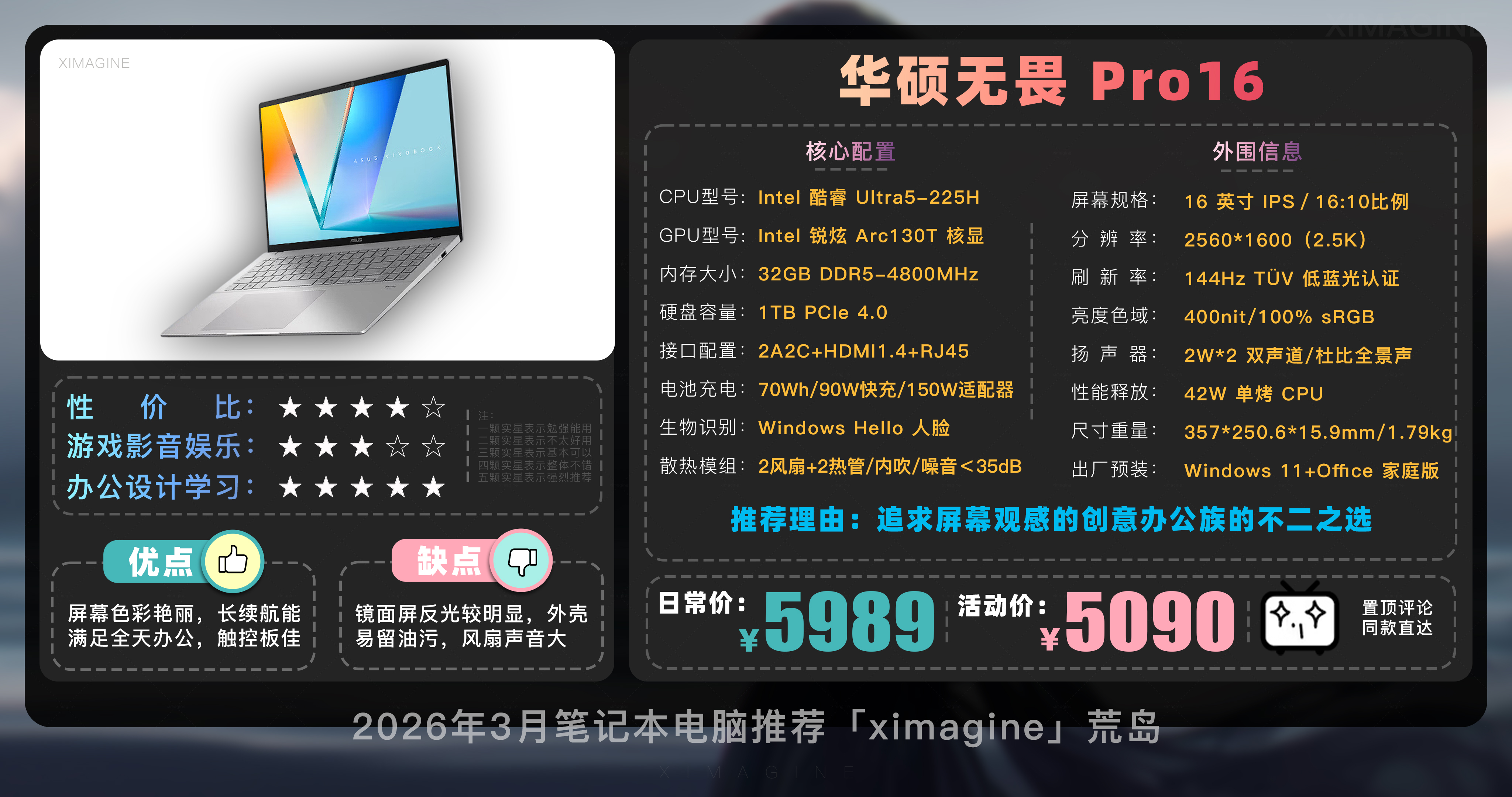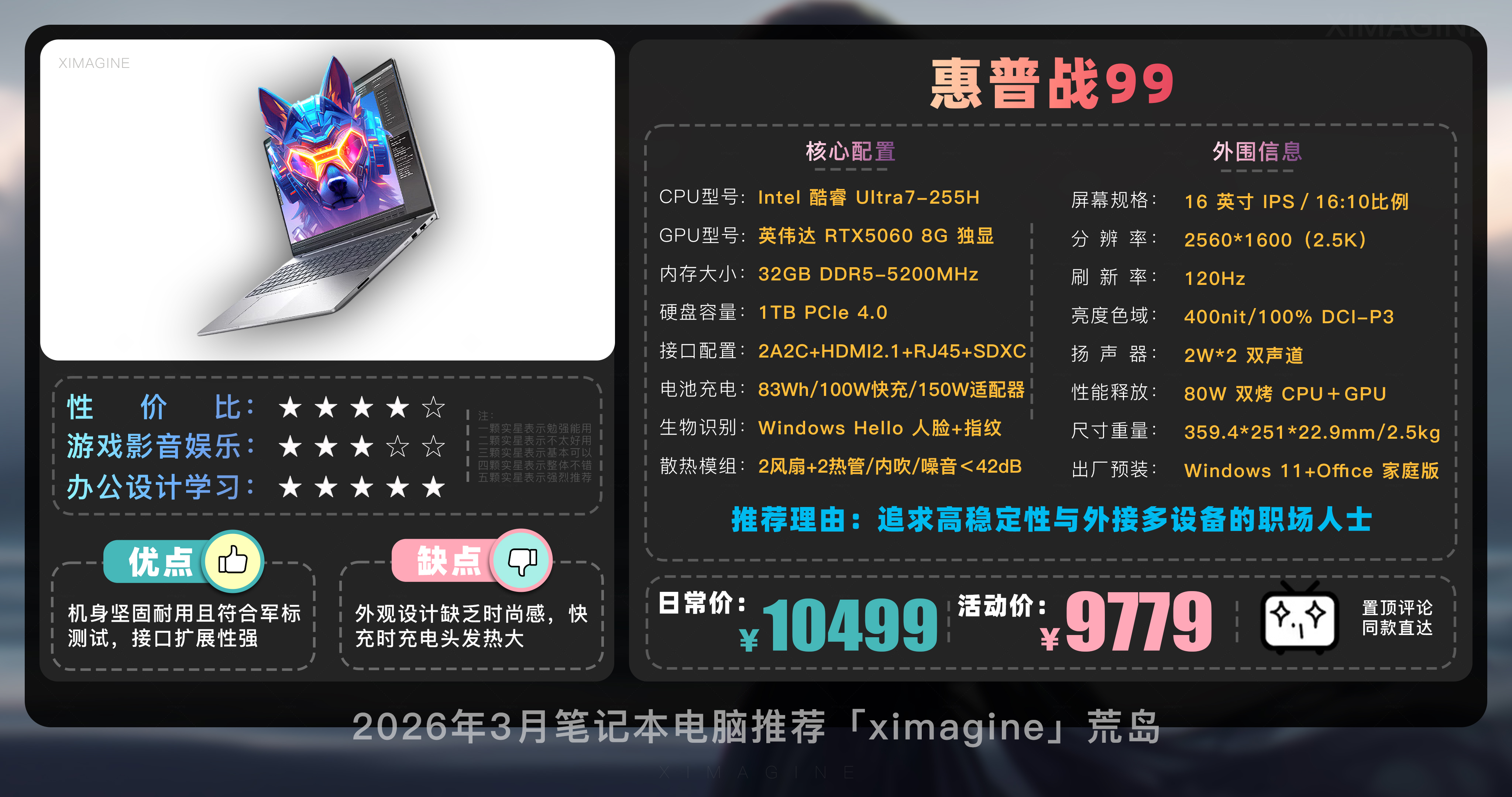 以上就是本期26年3月游戏本电脑推荐清单,如果有心水的型号,可以戳置顶评论区对应链接拿下!买笔电不看谁的广告打得响,得看谁能稳稳当当用上三五年;如果你是个打游戏的,或者要天天熬夜渲染视频,老老实实上游戏本或全能本;如果你每天要穿梭在图书馆、咖啡馆或者出差选轻薄本;如果觉得内容有所帮助,请关注荒岛!如果对选购笔记本电脑还有疑问,欢迎在评论区留言我会尽快回复大家。本期就到这,我是「ximagine」下期再会!