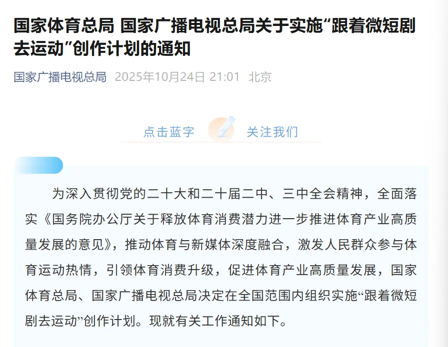 10月24日,国家体育总局与国家广播电视总局联合发布《关于实施“跟着微短剧去运动”创作计划的通知》,这是对9月4日国务院办公厅《关于释放体育消费潜力进一步推进体育产业高质量发展的意见》的迅速响应和具体部署。这份通知的发布,标志着“微短剧+体育”这一创新模式正式上升至国家战略层面。