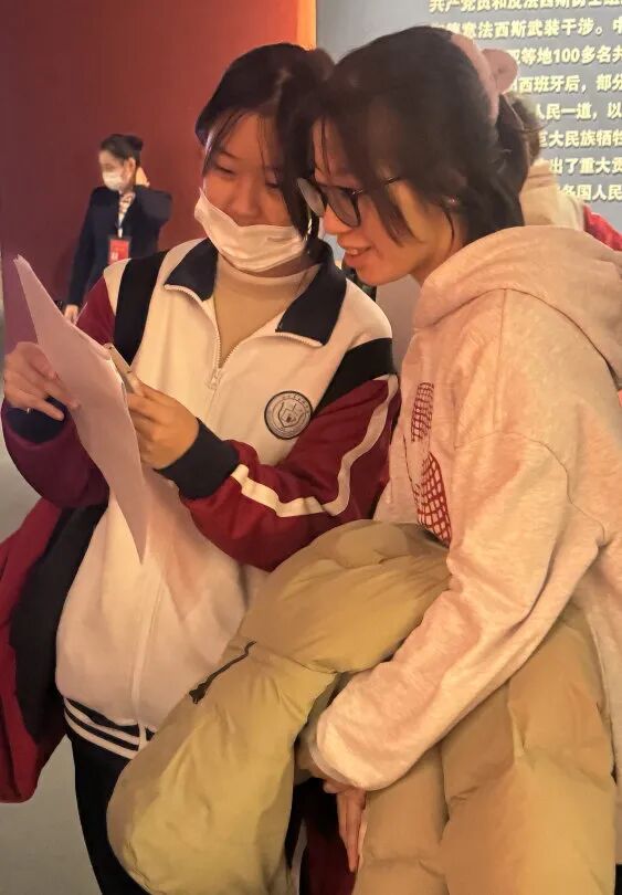 跟着讲解员的脚步,大家站在复原的革命场景前驻足:从中共一大的红船模型,到改革开放的实物展品,再到新时代的科技成果,每一段讲解都让课本里的文字有了画面;西语系的老师还会适时补充相关内容的外语表达,让 “理解当代中国” 在语言实践里落地。在首师大 “小讲师” 的带领下,中学生们对照研学手册 “按图索骥”,在 “建立中国共产党”“社会主义建设” 等展区,边聆听讲解边用西语标注展厅信息、记录历史知识点。遇到疑惑之处,主动举手提问,现场互动氛围热烈。