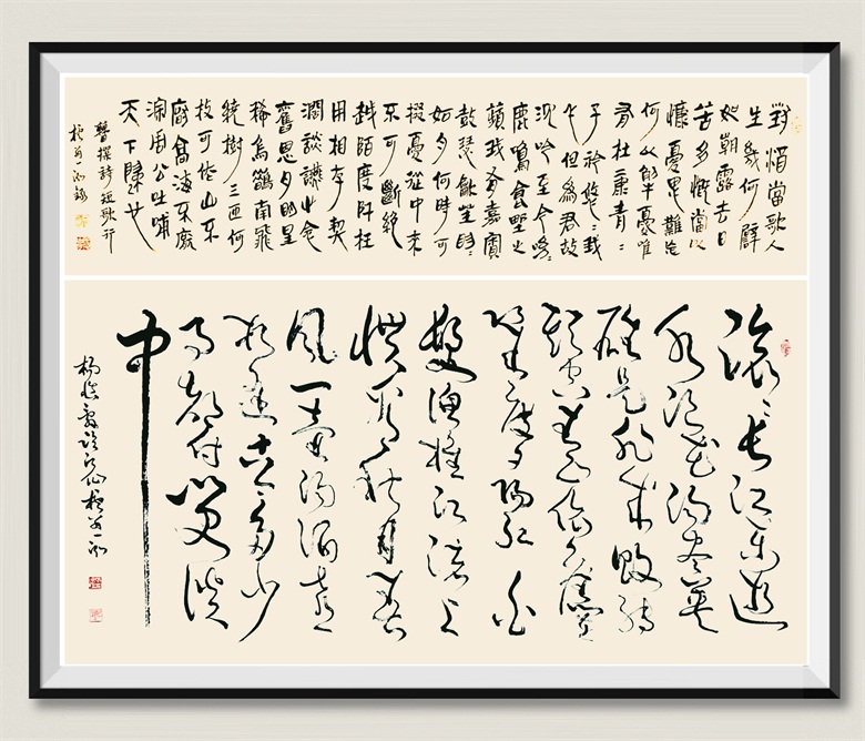 入笔、行笔、收笔,或快或慢、或收或放、或开或合,点有高山坠石之势、有百钧弩发之感、有鲲鹏击水之态,线有万岁枯藤之质、千里阵云之形、长虹饮涧之姿,却不能言其真,更不能道其妙,因为,一切都在情理之中,又常常出于意料之外,在情理之中的是法度,意料之外则给人一种意想不到的惊奇,那惊奇是若隐若现的个人才情、是乍合乍离的独特表现,属于张延明的别致、属于张延明的神韵,得益于几十年精修入境的传统功力,又以所感所悟融入对传统书法的理解而铸就了一家之貌的笔端升华。