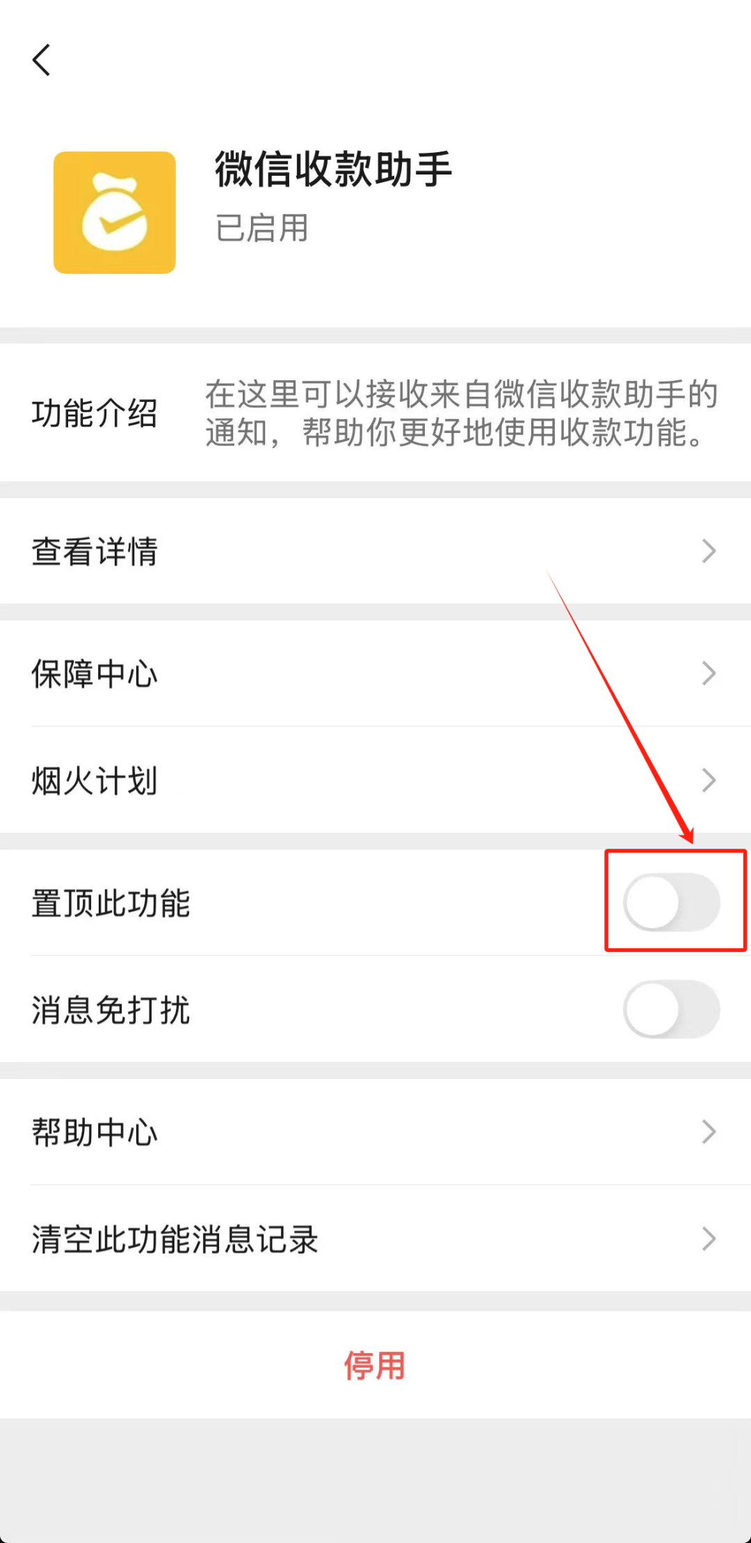 开启之后,我们可以打开“置顶此功能”后的滑动开关,进行置顶,这样更好地方便我们后续使用。