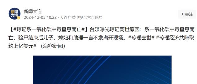 去世当天,儿媳依照约定到了琼瑶住所后,发现琼瑶已于沙发上安然离世。