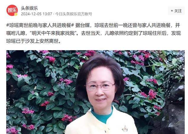琼瑶去世前一晚还曾与家人共进晚餐,并嘱咐儿媳,“明天中午来我家找我”。