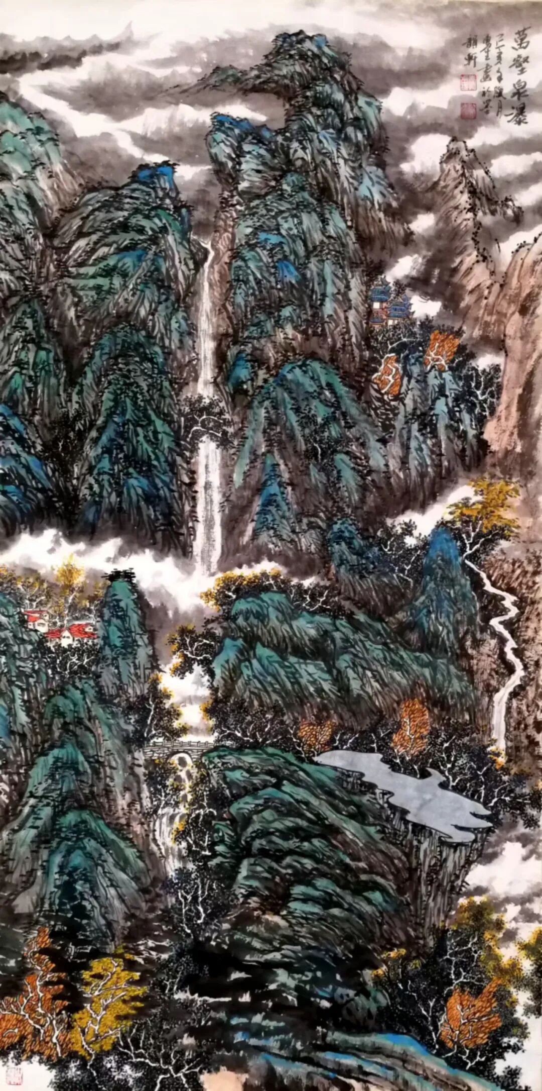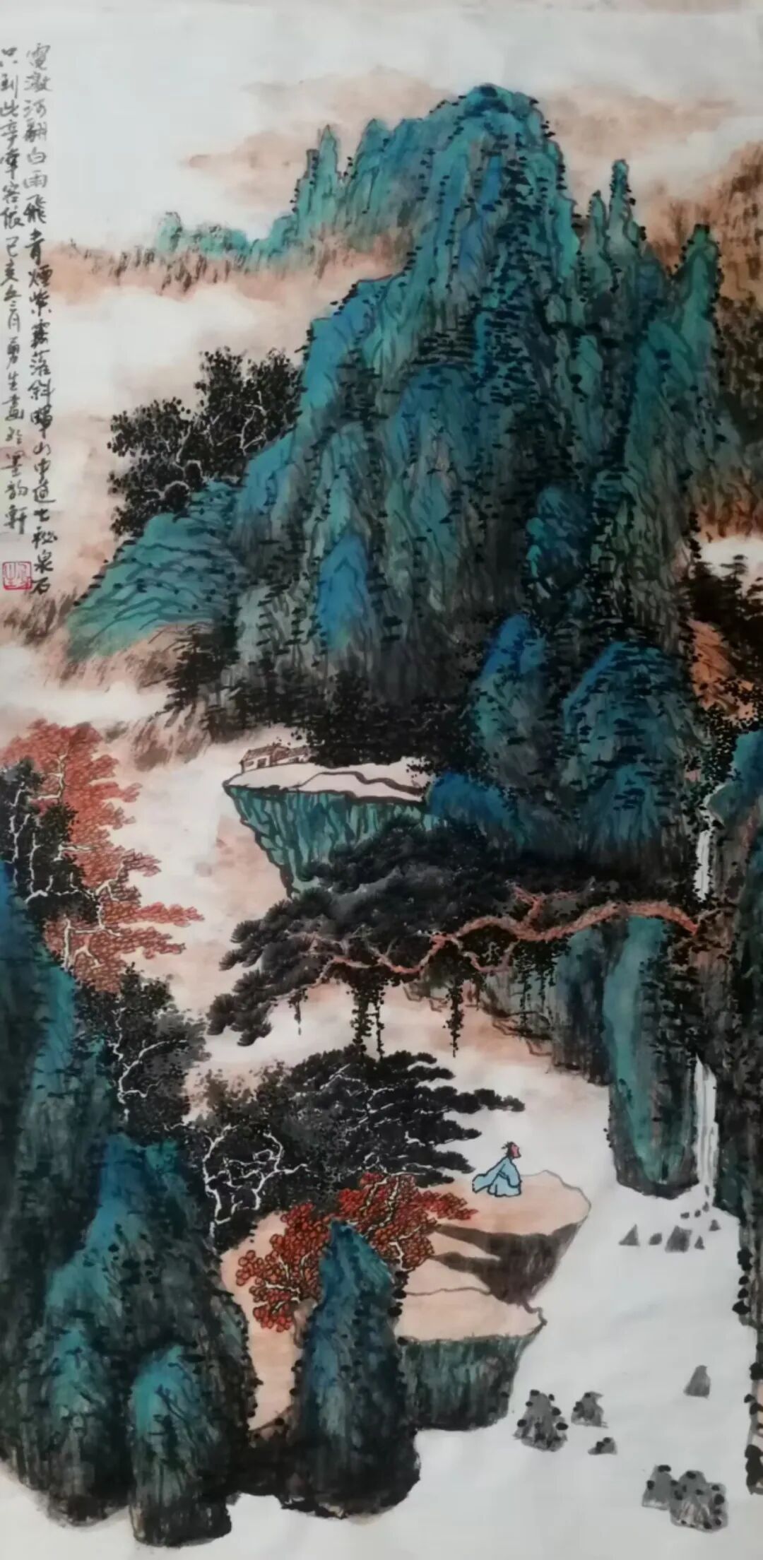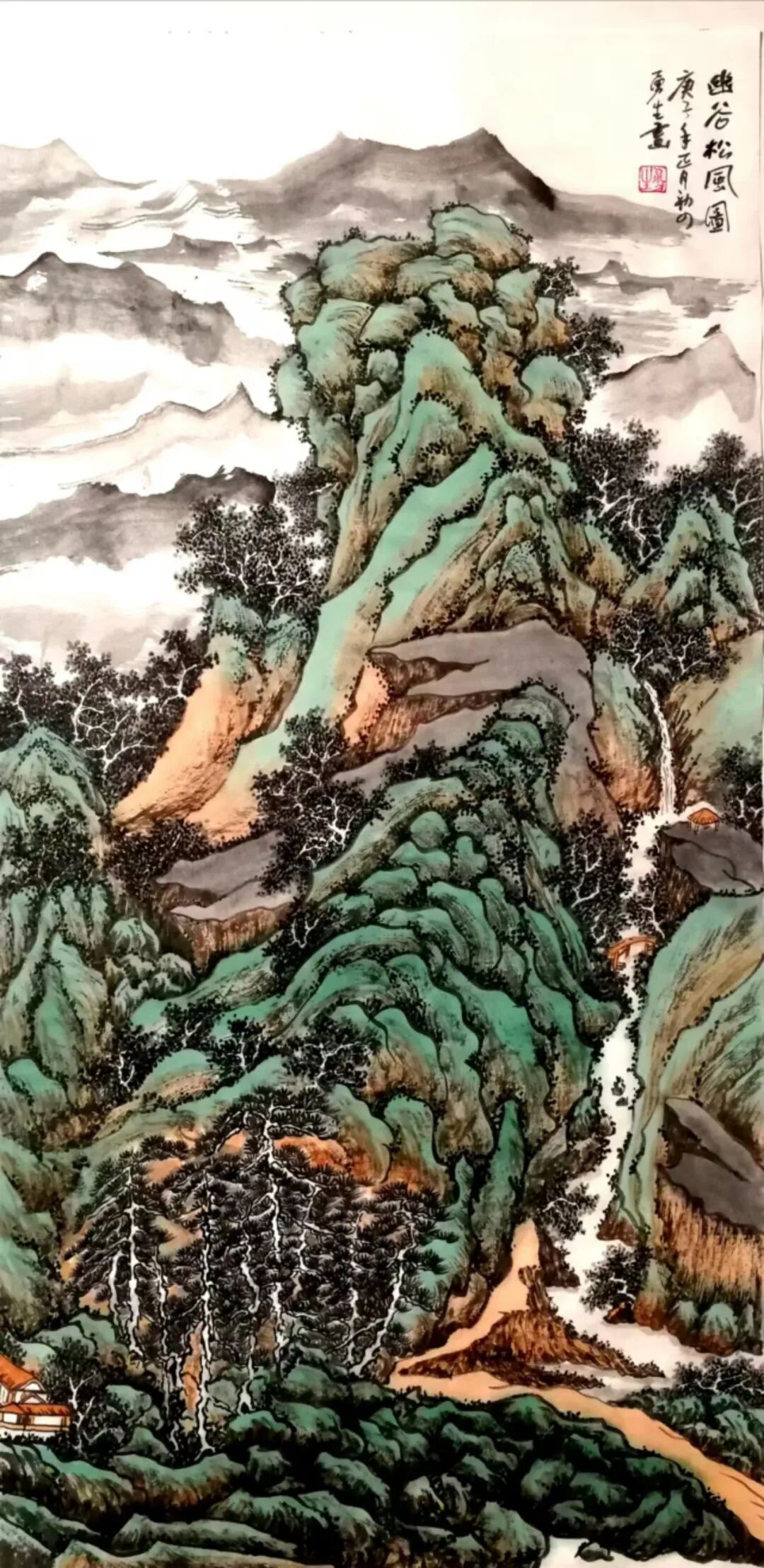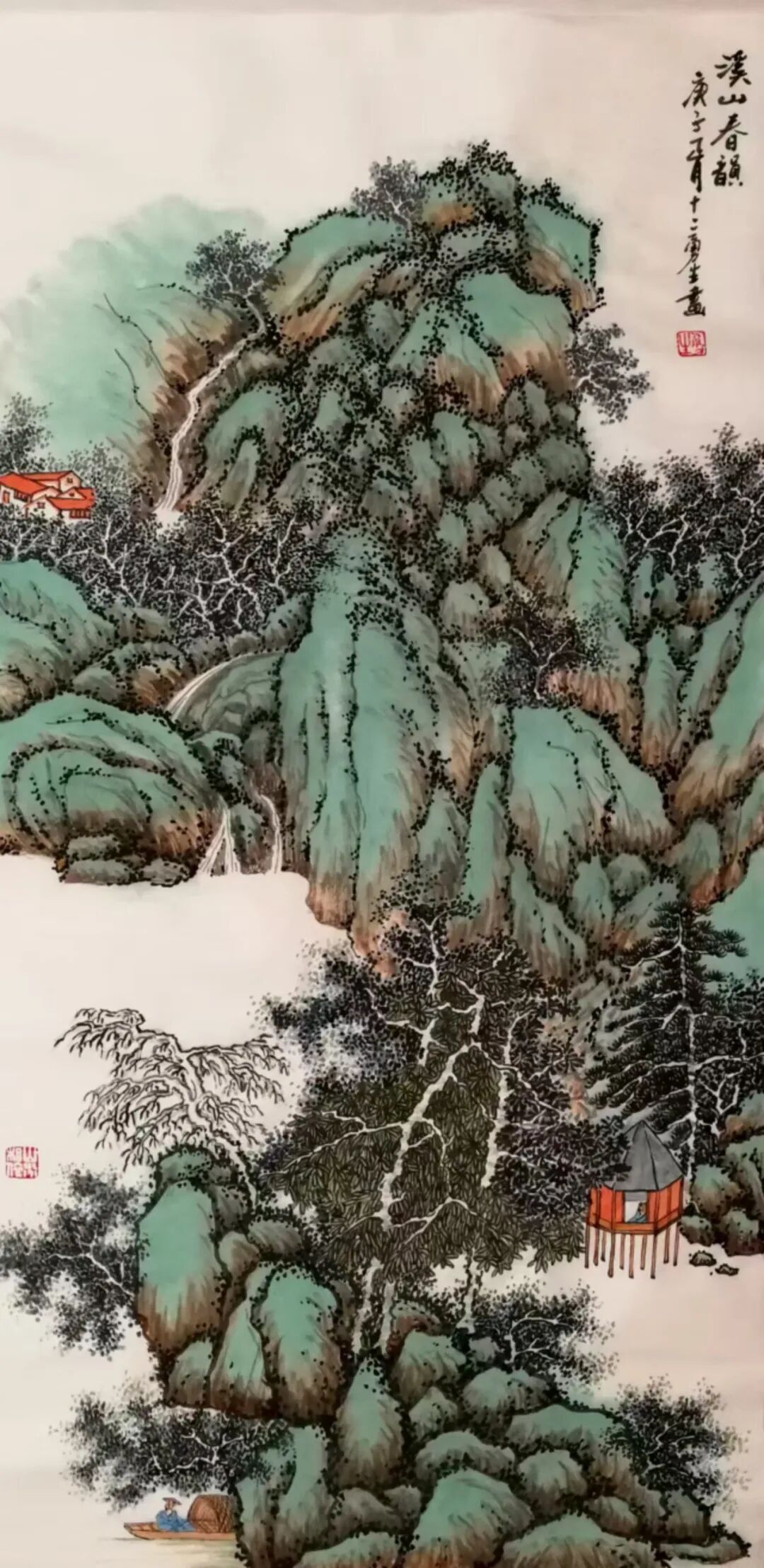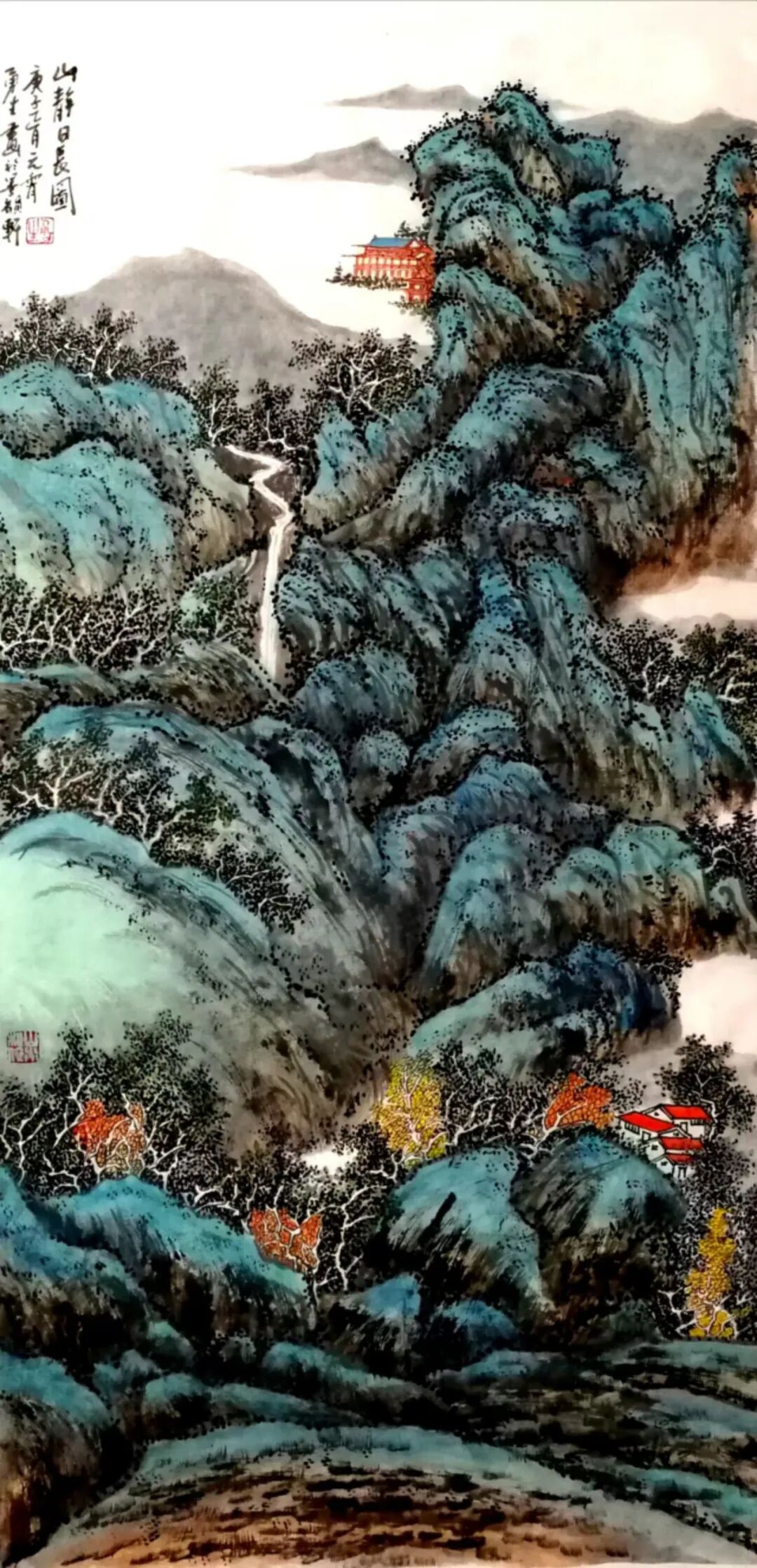 蒋勇生在色彩运用上打破了传统山水画以水墨为主的单一色调,通过色彩的对比与调和,创造出更具现代感的视觉效果。他以青绿色为主调,通过色彩的渐变与叠加,表现出山水的四季变化。这种色彩处理方式既保留了传统青绿山水的典雅气质,又通过色彩的创新运用,使画面更具时代感。