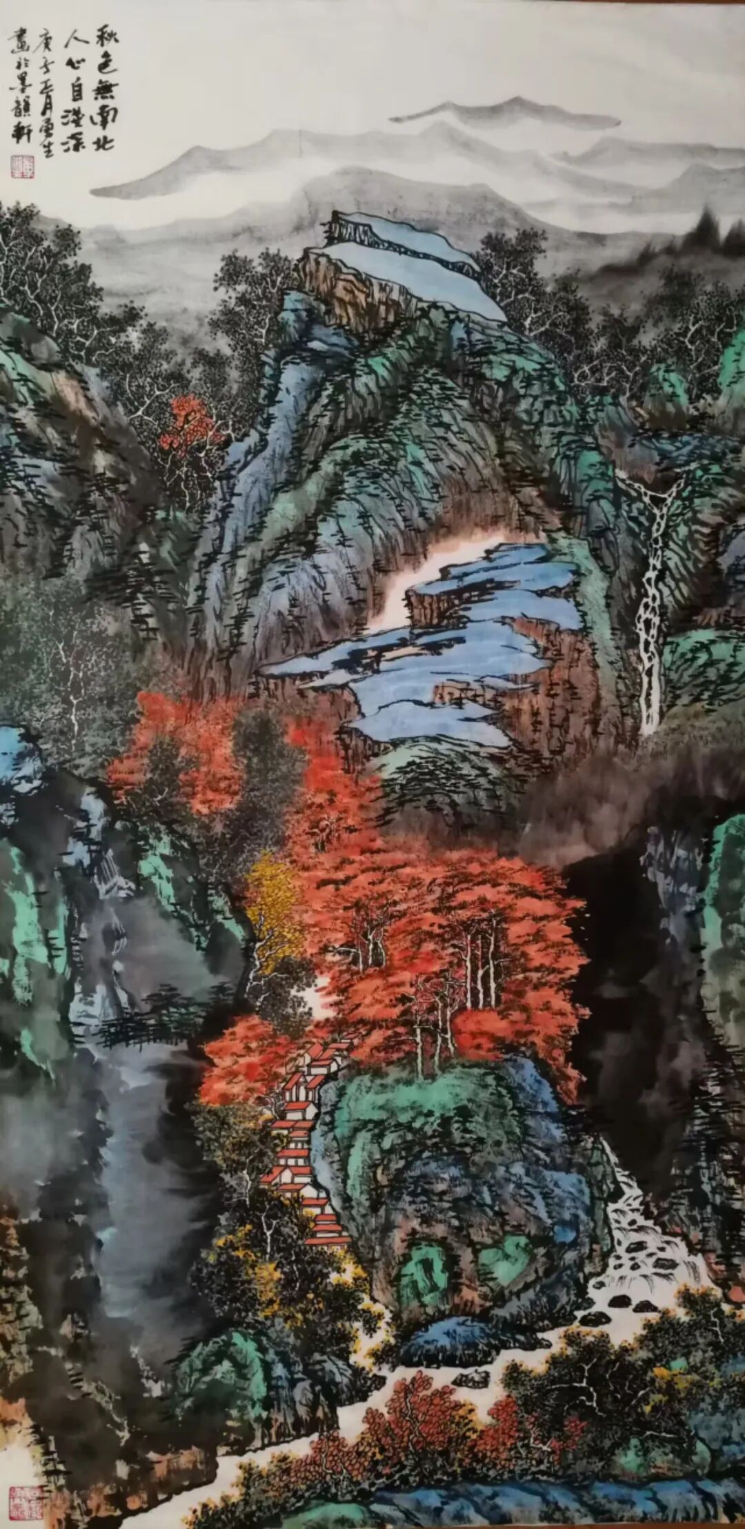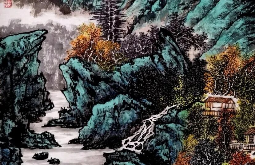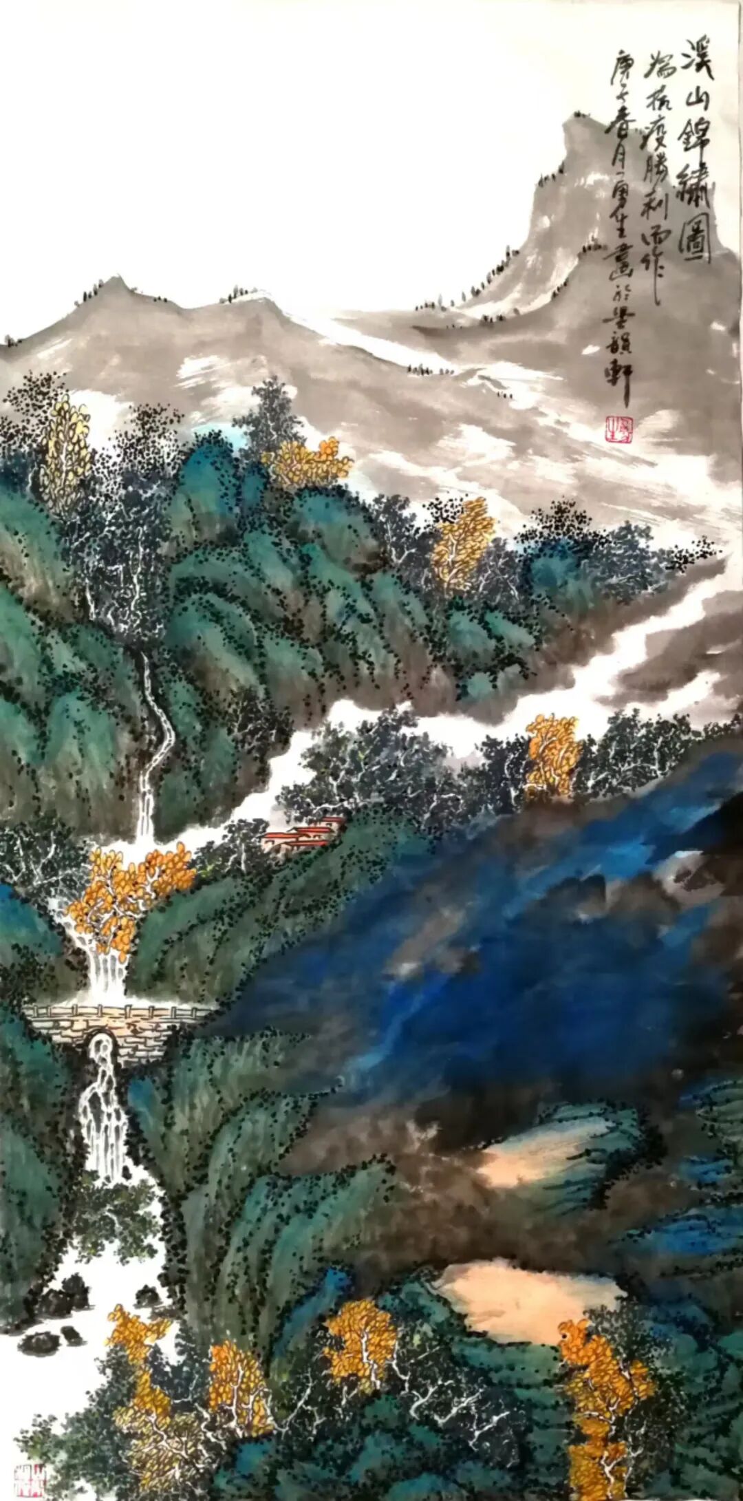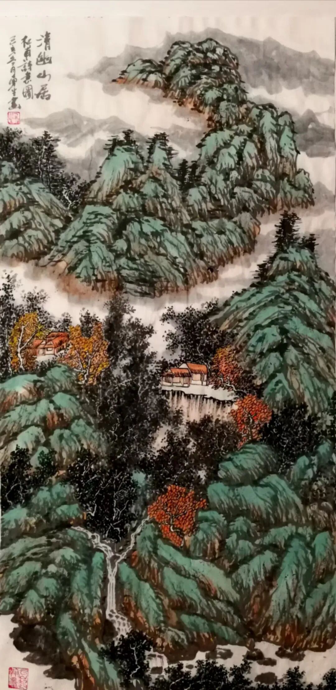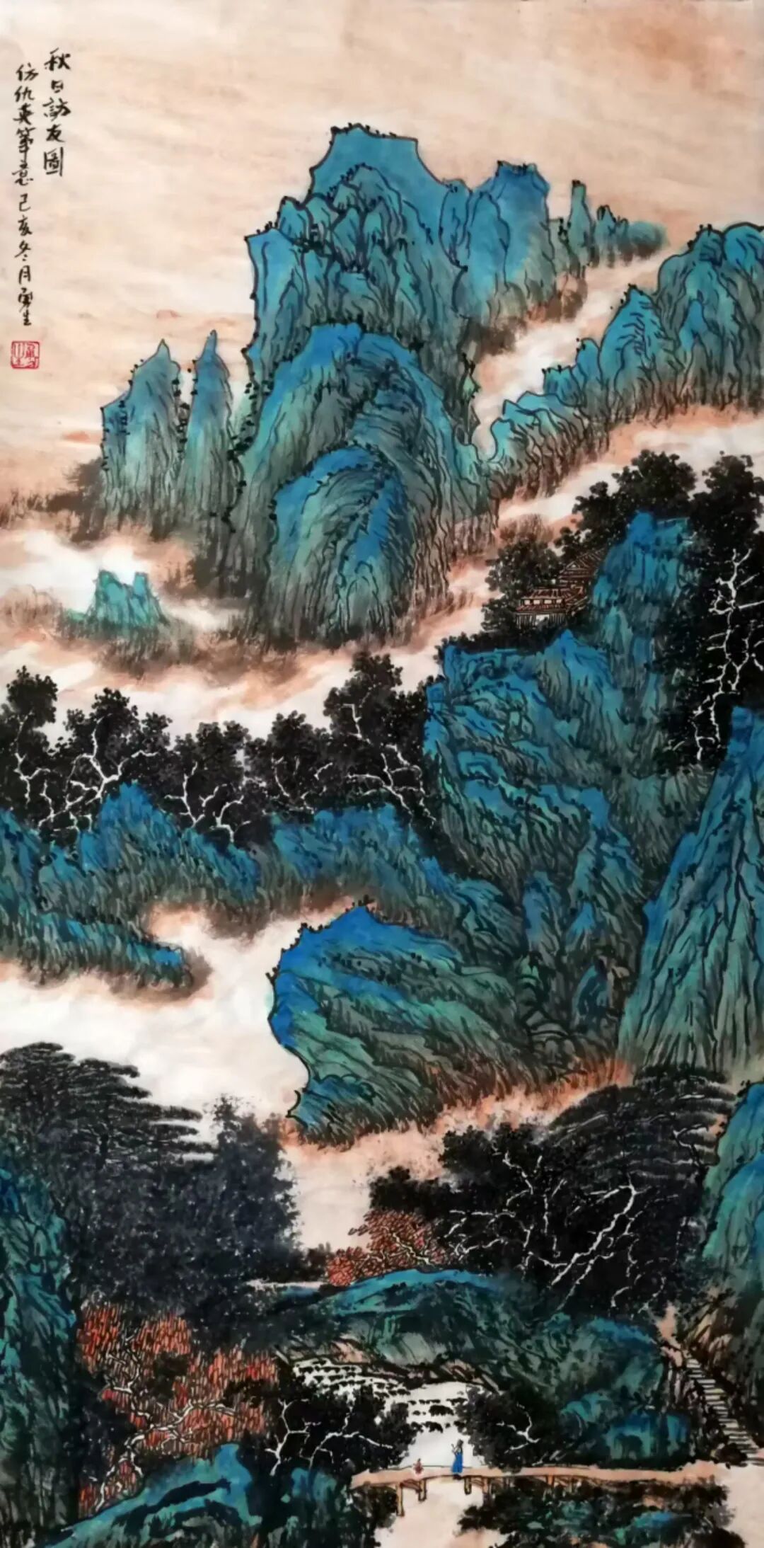 蒋勇生在色彩运用上打破了传统山水画以水墨为主的单一色调,通过色彩的对比与调和,创造出更具现代感的视觉效果。他以青绿色为主调,通过色彩的渐变与叠加,表现出山水的四季变化。这种色彩处理方式既保留了传统青绿山水的典雅气质,又通过色彩的创新运用,使画面更具时代感。