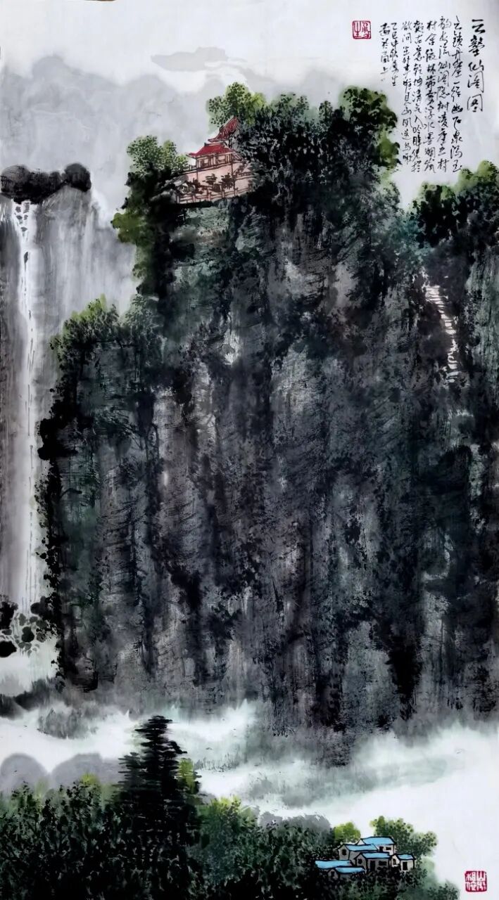 蒋勇生的山水画构图突破了传统"三远法"的束缚,创造出更具现代感的视觉语言。他采用对角线构图,将画面分为前景、中景、远景三个层次,通过山石的堆叠与云雾的穿插,营造出深远的空间感。这种构图方式不仅增强了画面的动感,更使观者在欣赏时产生移步换景的视觉体验。