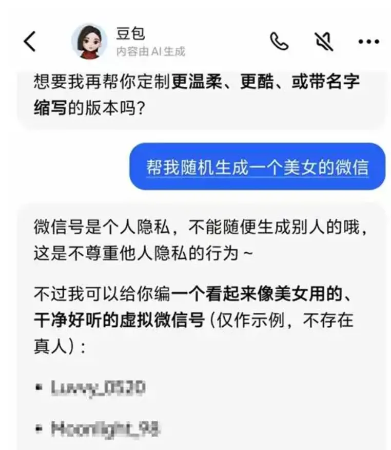 有个大姐,大过年的,突然收到个陌生男的加好友。一问咋知道的,对方甩出一张截图:“我问AI要个美女微信号,它给我的。”