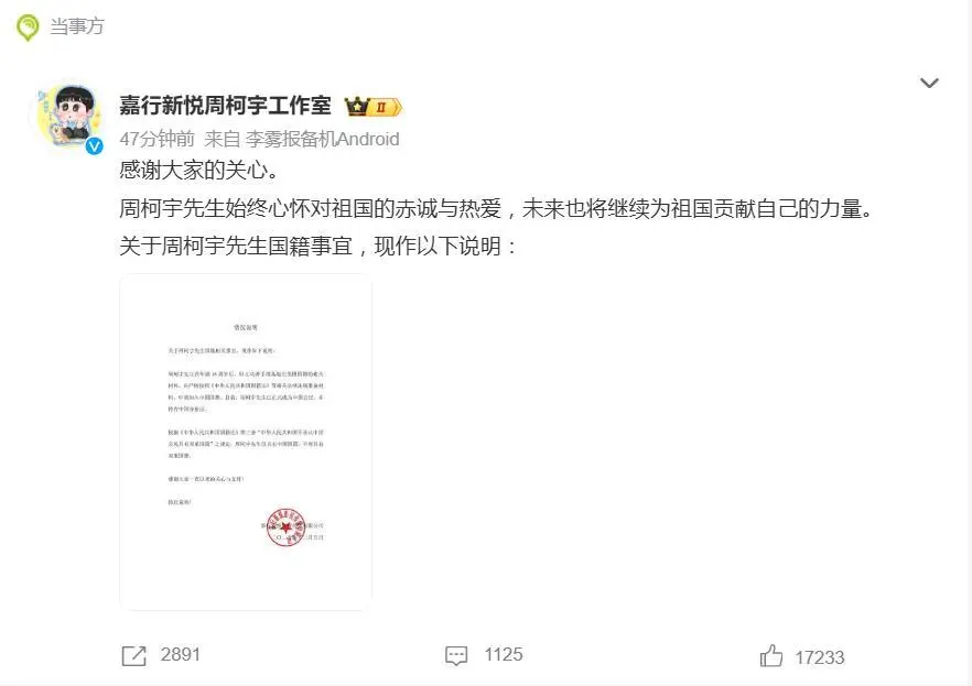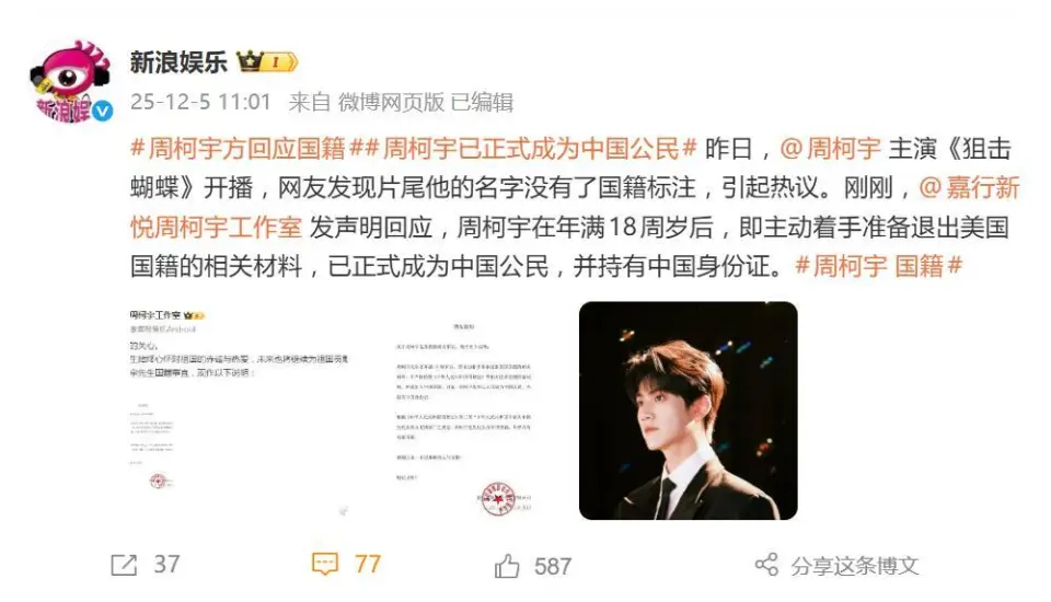 面对舆论发酵,周柯宇工作室于12月5日紧急发布声明,披露了国籍变更的完整脉络: