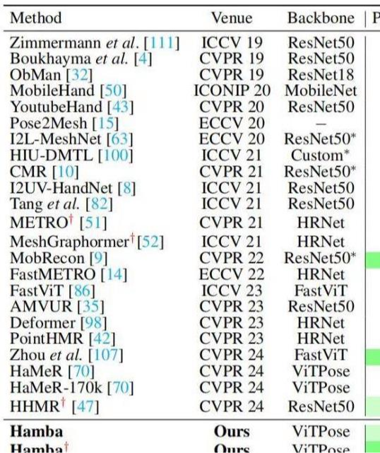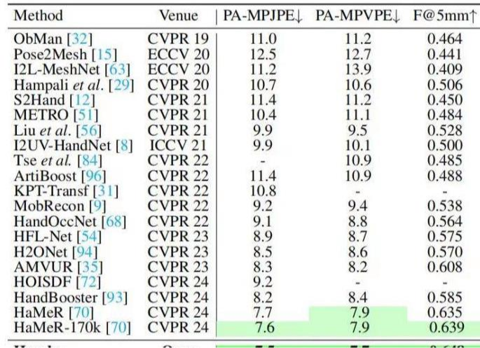 此外,Hamba框架提出了一种图引导的双向扫描(GBS)方法。与传统的单向扫描方法不同,GBS方法通过两个方向的扫描(前向和后向)来捕捉手关节之间的空间关系。这种双向扫描方式不仅减少了需要处理的令牌数量(从192减少到22,即减少了约88.5%),而且能够更好地捕捉手关节之间的局部和全局关系。▍Hamba框架在多个评价指标上取得不俗成绩为了验证Hamba框架的有效性,研究人员在FreiHAND、HO3Dv2和HO3Dv3等基准数据集上进行了实验,并与现有的先进方法进行了比较。