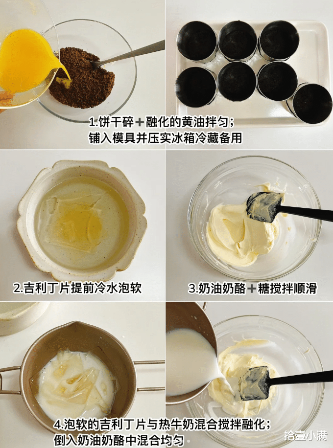 1.饼干碎+融化的黄油拌匀;铺入模具并压实冰箱冷藏备用