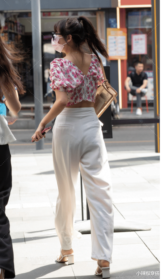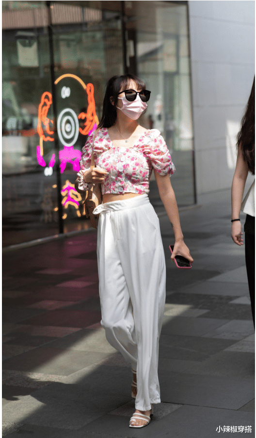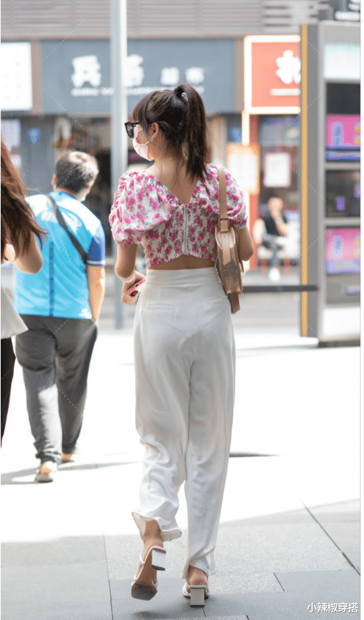 白色休闲裤搭配短款印花衬衫会更时髦,如果想要用小白裤打造潮范气质,还可以选择荧光白,这种白色的亮度非常高,反光效果更加拉伸腿长,穿起来更凉爽。因为碎花上衣是属于短裤的,一条高腰设计的小白裤更加展现美女的小蛮腰,利用高腰线可以轻松打造好身材。