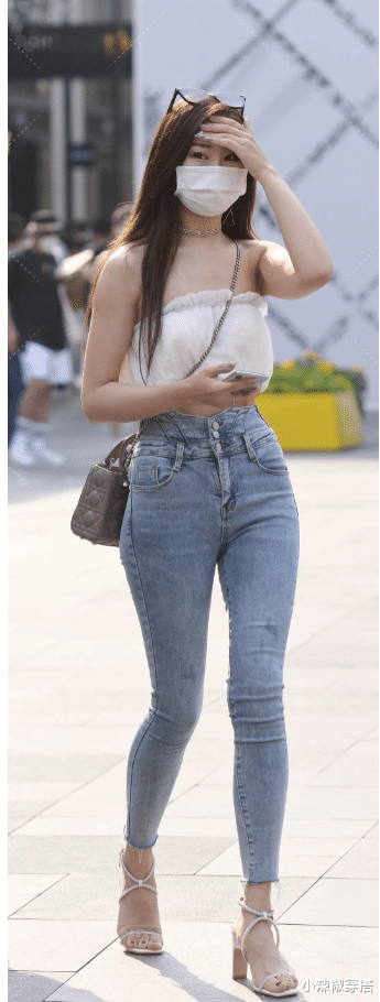 这位美女的衣品是非常时尚的,即使戴着口罩,也可以看出五官非常精致。美女身材凹凸有致,一件抹胸纯白雪纺上衣搭配高腰牛仔裤,丰盈身材完美地展示出来。抹胸上衣较短,露出纤细的腰部,跟高腰牛仔裤非常搭。
