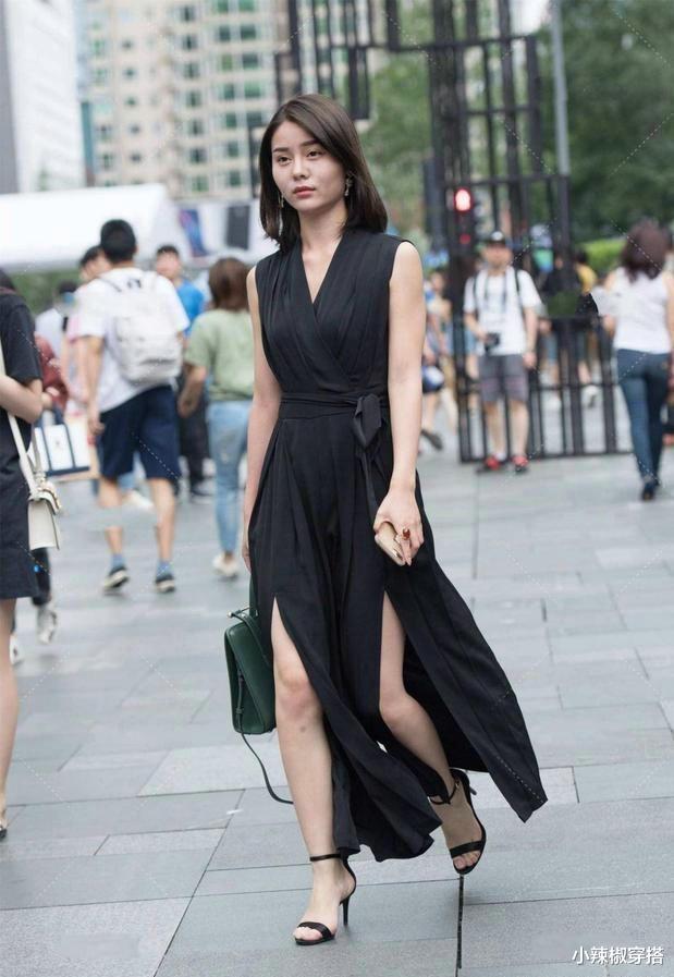 连衣裙搭配同色系高跟鞋,给人一种简单大气的感觉,体现出职场女性的强大气场。而收腰的设计,又很好地提高了腰线,看起来整个人更加显高显瘦。宽松的开叉裙摆潇洒飘逸,更显强大的气场。