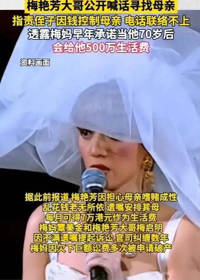 最让人心寒的是,2008年梅艳芳去世五周年的纪念活动上,原本应该庄严肃穆的场合,覃美金却公然质疑梅艳芳的遗嘱被篡改,闹得纪念会一片混乱。这一行为,让无数梅艳芳的歌迷失望透顶,失去了对她的尊重与同情。令人唏嘘的是,母子之间的这段因金钱纠葛而捆绑的关系,最终也因利益而彻底决裂。2021年,当传记电影《梅艳芳》上映,梅启明闻到了钱的味道,竟然以梅艳芳商标侵权为由,将电影制作方告上法庭,索要巨额赔偿。覃美金开始深知,自己已经翻不了盘,每月稳稳当当拿到的25万生活费才是最实在的事情。于是,为了确保自己的利益,她干脆高调登报,宣布与梅启明断绝母子关系,搬离了旧居,彻底与他断开联系,留下梅启明一人在原地孤立无援。