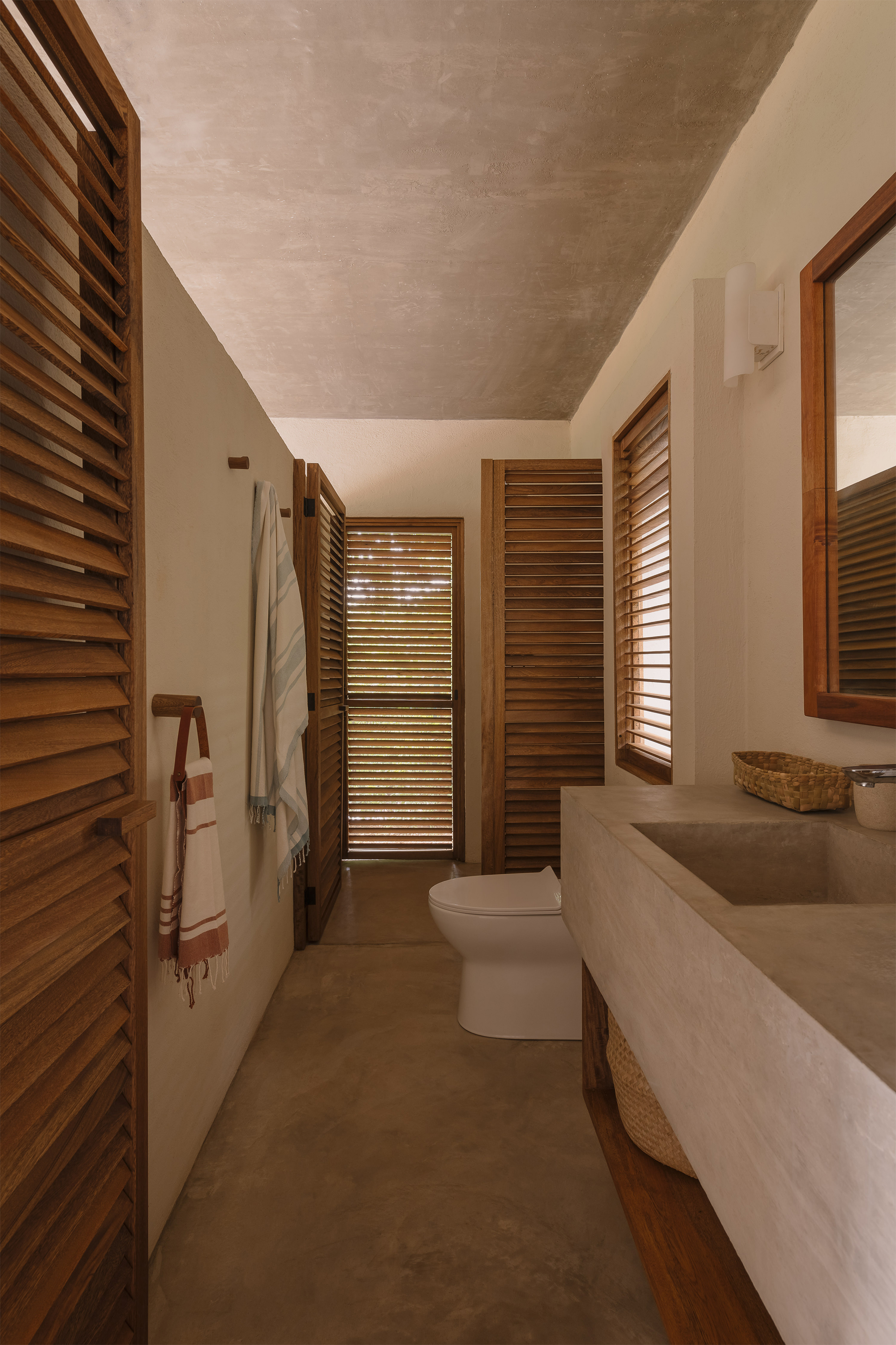 客房空间设计时,下层可与服务区直接连通花园,便于自然地过渡至户外生活。上层则完全向辽阔的景致敞开,主要起居空间仿佛是景观的延伸。设计充分顺应场地条件,实现了高效的穿堂风、充沛的自然采光与宜人的微气候,大幅减少对人工制冷的依赖。
