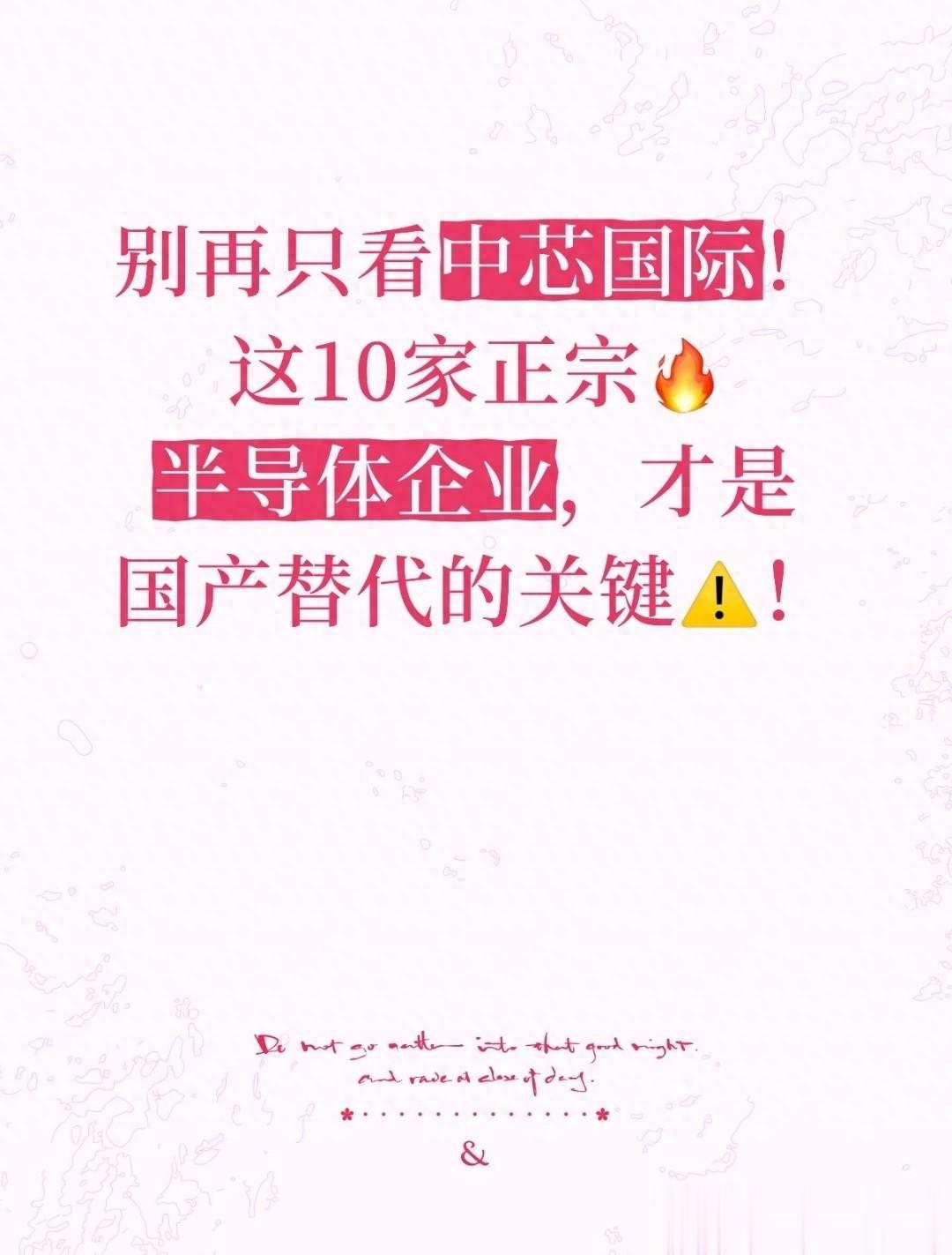 在全球半导体产业重构的浪潮中,国产半导体企业不再是产业链的配角。从芯片制造的核心代工环节,到材料、设备、封装测试等配套领域,一批本土企业凭借技术突破和产能布局,在细分赛道站稳了脚跟,成为国产替代的核心力量。这些企业各自扎根不同环节,用硬核实力填补国内半导体产业的空白,今天就从产业实际发展角度,拆解这10家企业的核心价值与成长逻辑,让大家看清国产半导体的真实发展脉络。