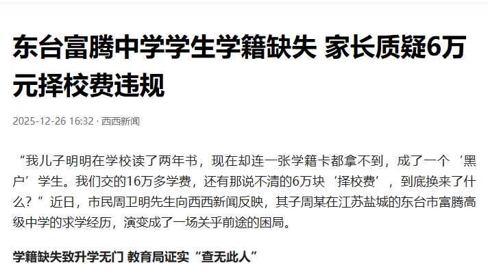 “我儿子明明在学校读了两年书,现在却连一张学籍卡都拿不到,成了一个‘黑户’学生。我们交的16万多学费,还有那说不清的6万块‘择校费’,到底换来了什么?”近日,市民周卫明先生向西西新闻反映,其子周某在江苏盐城的东台市富腾高级中学的求学经历,演变成了一场关乎前途的困局。