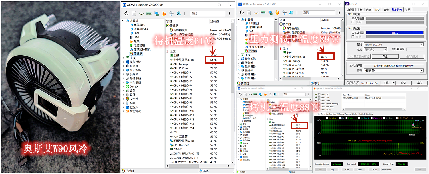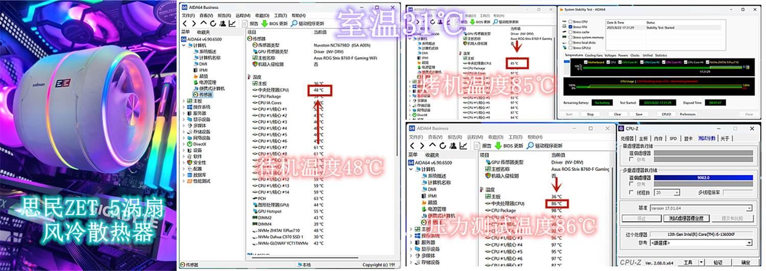 Zalman思民ZET5的最大亮点不仅仅在于其外观设计,散热性能同样令人期待。这次测试的平台条件采用中规中矩的配置,华硕B760 F主板+Intel 13600KF处理器(这个配置应该是比较主流的一个配置),运行了CPU-Z和FPU负载测试,模拟了长时间高负载的场景。